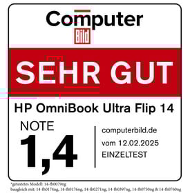Testurteil von computerbild.de vom 12.02.2025, Ausgabe 12.02.2025, Seite artikel/cb-Tests-Notebooks-HP-OmniBook-Ultra-Flip-Test-Review-Convertible-39440559.html: "SEHR GUT 1,4"