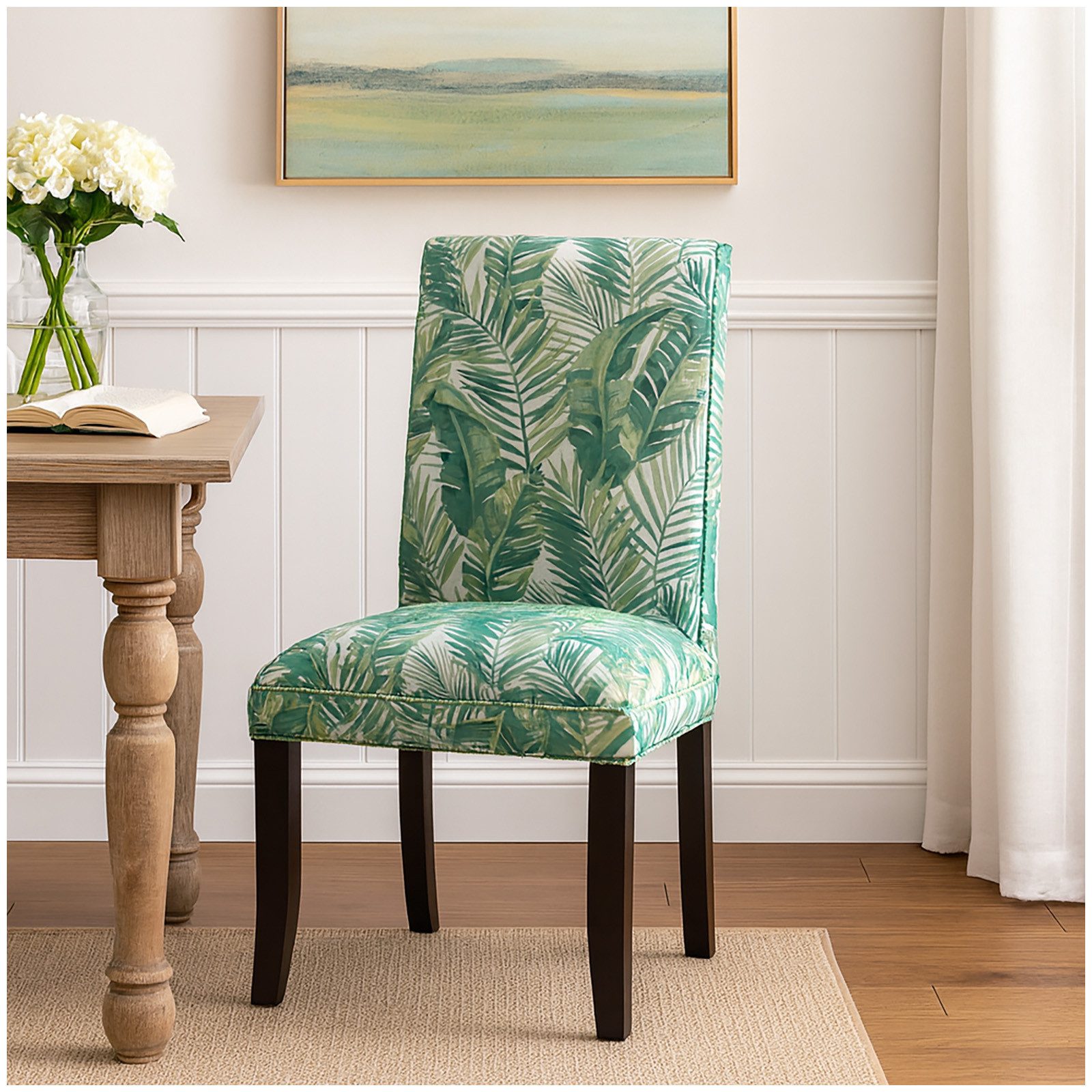 Bringen Sie tropisches Flair in Ihr Zuhause mit diesem stilvollen Esszimmerstuhl im modernen Landhausstil. Der Stuhl überzeugt durch seine hohe Rückenlehne, die bequeme Polsterung und den hochwertigen Stoffbezug mit grünem Blätter-Design. Mit seinen Maßen von 54 x 102 x 66 cm (Breite x Höhe x Tiefe) bietet er komfortables Sitzen und passt perfekt in Esszimmer, Wohnzimmer oder Wintergarten. Die robusten Massivholzbeine in dunkler Ausführung sorgen für Stabilität und eine lange Lebensdauer. Dank des trendigen Musters mit Palmen- und Blätteroptik setzt der Polsterstuhl dekorative Akzente und lässt sich vielseitig kombinieren. Ob als einzelner Akzentstuhl oder in Kombination an einem Esstisch – dieser Stuhl verbindet Design, Komfort und Qualität auf höchstem Niveau.