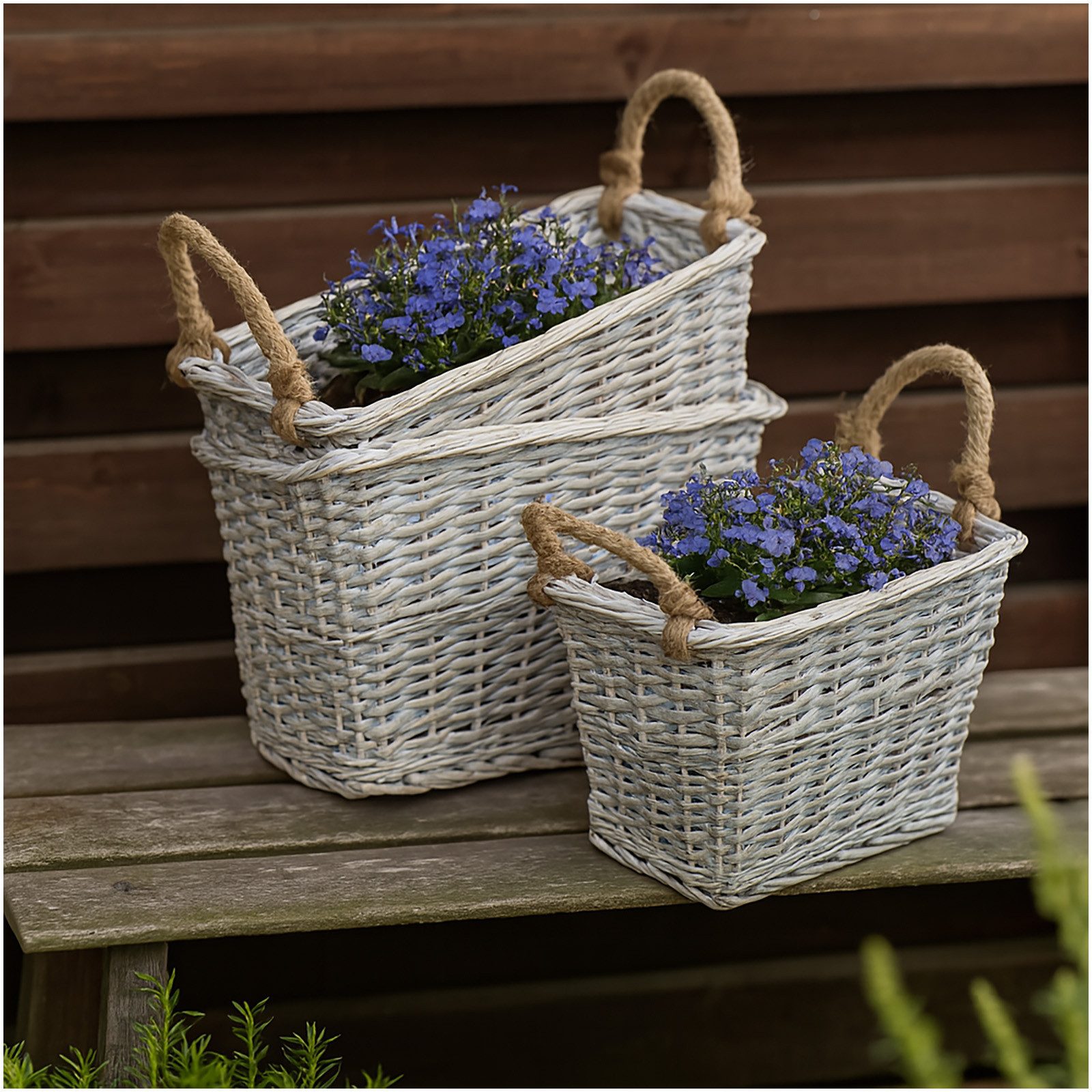 Verleihen Sie Ihrem Zuhause oder Garten natürlichen Charme mit diesen dekorativen Pflanzkörben im praktischen 3er-Set. Die Körbe bestehen aus weiß gekalkter Weide und sind mit robusten Jute-Seilgriffen ausgestattet – ideal für ein modernes Landhausambiente oder rustikale Dekoration. Dank der verschiedenen Größen eignen sich die Körbe perfekt zum stilvollen Bepflanzen, Arrangieren von Trockenblumen oder als Aufbewahrungskörbe im Wohnbereich. Ob auf dem Balkon, in der Küche oder im Eingangsbereich – diese Körbe setzen Ihre Pflanzen oder Dekoartikel effektvoll in Szene. 3er-Set mit abgestuften Größen: Groß: 41 x 29 x 32 cm Mittel: 35 x 25 x 28 cm Klein: 27 x 17 x 24 cm
