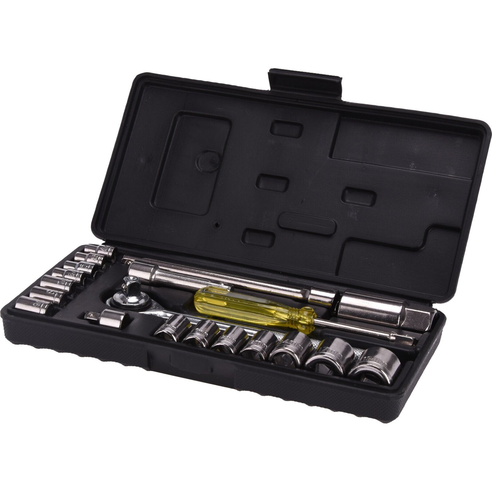 Ein Steckschlüsselsatz bestehend aus: 1x Schraubendreher 1/4" 1x Verlängerung 14 cm 1x Verlängerung 7cm 1x Adapter 3/8" > 1/4" 1x Ratsche 3/8" 1x 21 Zündkerzenanschluss (13/16") 7x 3/8" Anschlüsse: 19, 17, 14, 13, 12, 11, 10 mm 7x 1/4" Anschlüsse: 9, 8, 7, 6, 5, 4,5, 4 mm 1x Aufbewahrungsbox aus Kunststoff - Maße: ca. 25 x 12 x 4,5cm