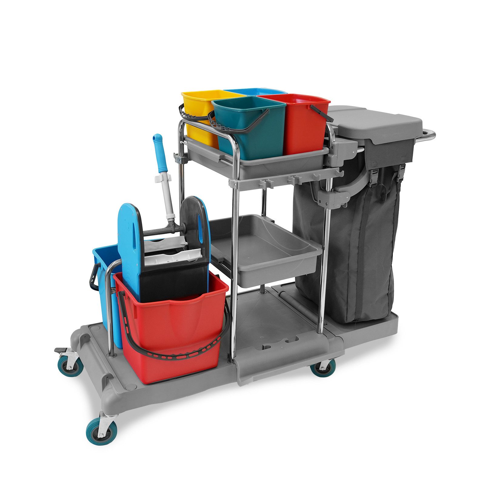 PRAKTISCH: Der Reinigungswagen hat alles, was man für eine gründliche Reinigung benötigt – 2x Eimer, eine Mopp-Presse, einen Leinensack & Halterungen für Putzgeräte.