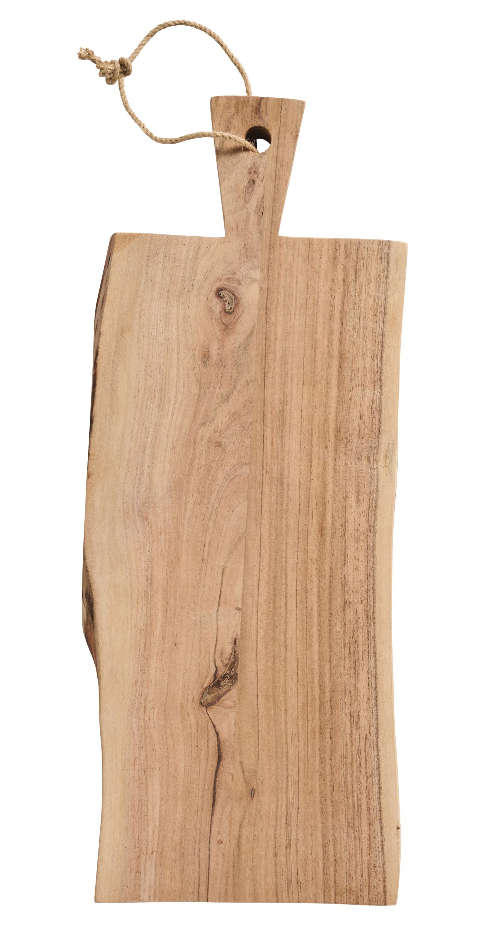Verleihen Sie Ihrer Küche eine natürliche und persönliche Note mit diesem wunderschönen Schneidebrett aus Akazienholz. Jedes Brett ist ein Unikat mit unregelmäßigen Kanten und einer charaktervollen Maserung. Die praktische Aufhängung aus Juteschnur macht es leicht verstaubar und lässt sich gleichzeitig dekorativ in Szene setzen. Ideal als Servierbrett oder rustikale Tischdekoration.