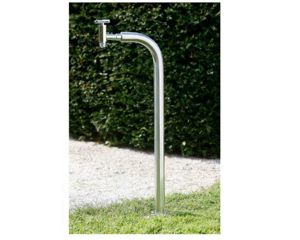 Dekorative, hochwertige Wasserentnahmestelle IDEAL Modell 71 für den Garten aus Edelstahl, runde Ausführung mit geschliffenem Gehäuse, mit geschwungenem Bogen, Maße Zapfsäule: Ø 40 mm.