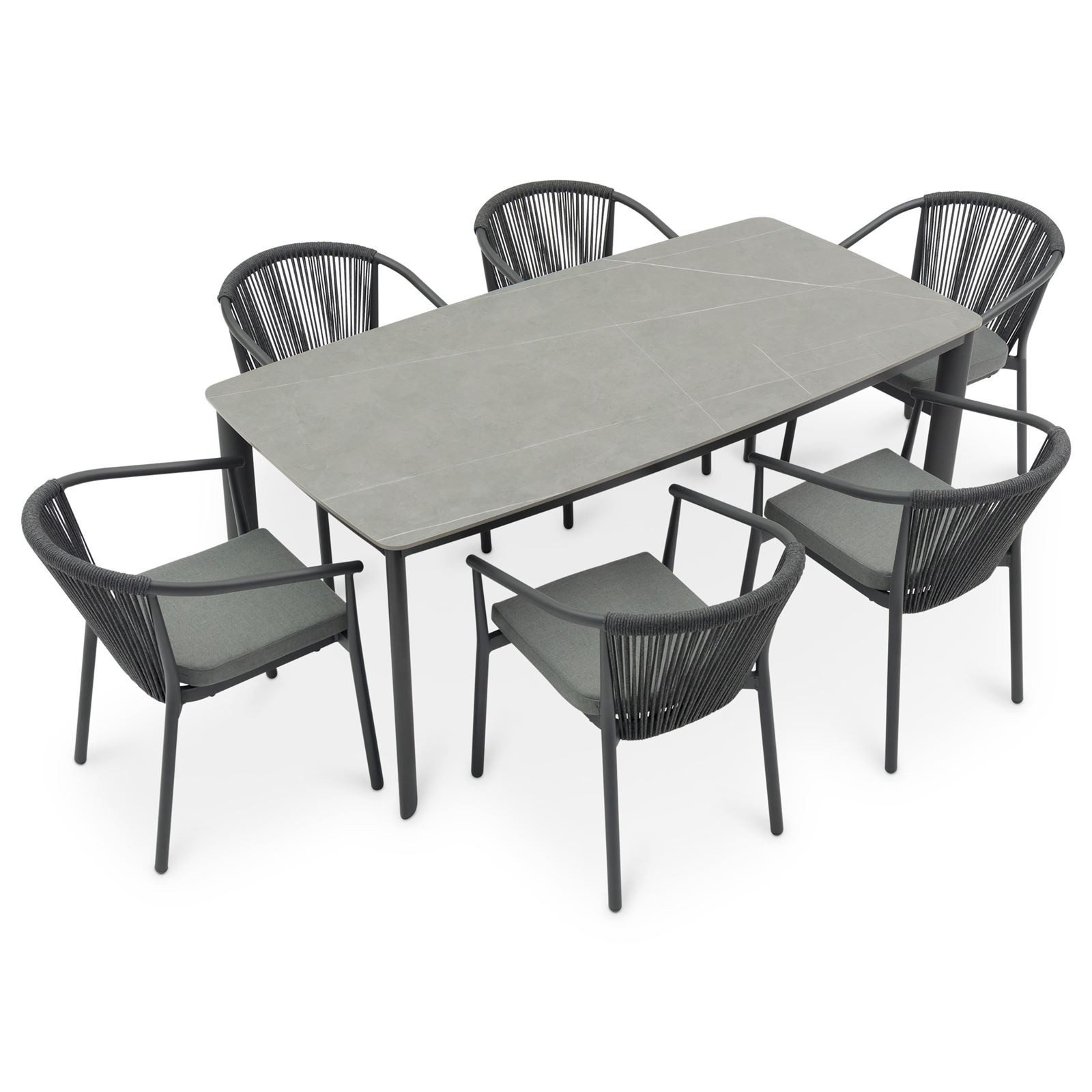 Das Terrassenmöbel Set Tavolo verbindet modernes Design mit durchdachtem Komfort für deinen Außenbereich. Sechs stilvolle Stühle mit Armlehnen und dezenten Rope-Details laden gemeinsam mit dem großzügigen Tisch zu entspannten Momenten im Freien ein. Weiche Kissen in Dunkelgrau bieten angenehmen Sitzkomfort, während wetterfeste Materialien Langlebigkeit und unkomplizierte Pflege garantieren. Perfekt für gemütliche Runden im Garten, auf der Terrasse oder dem Balkon.