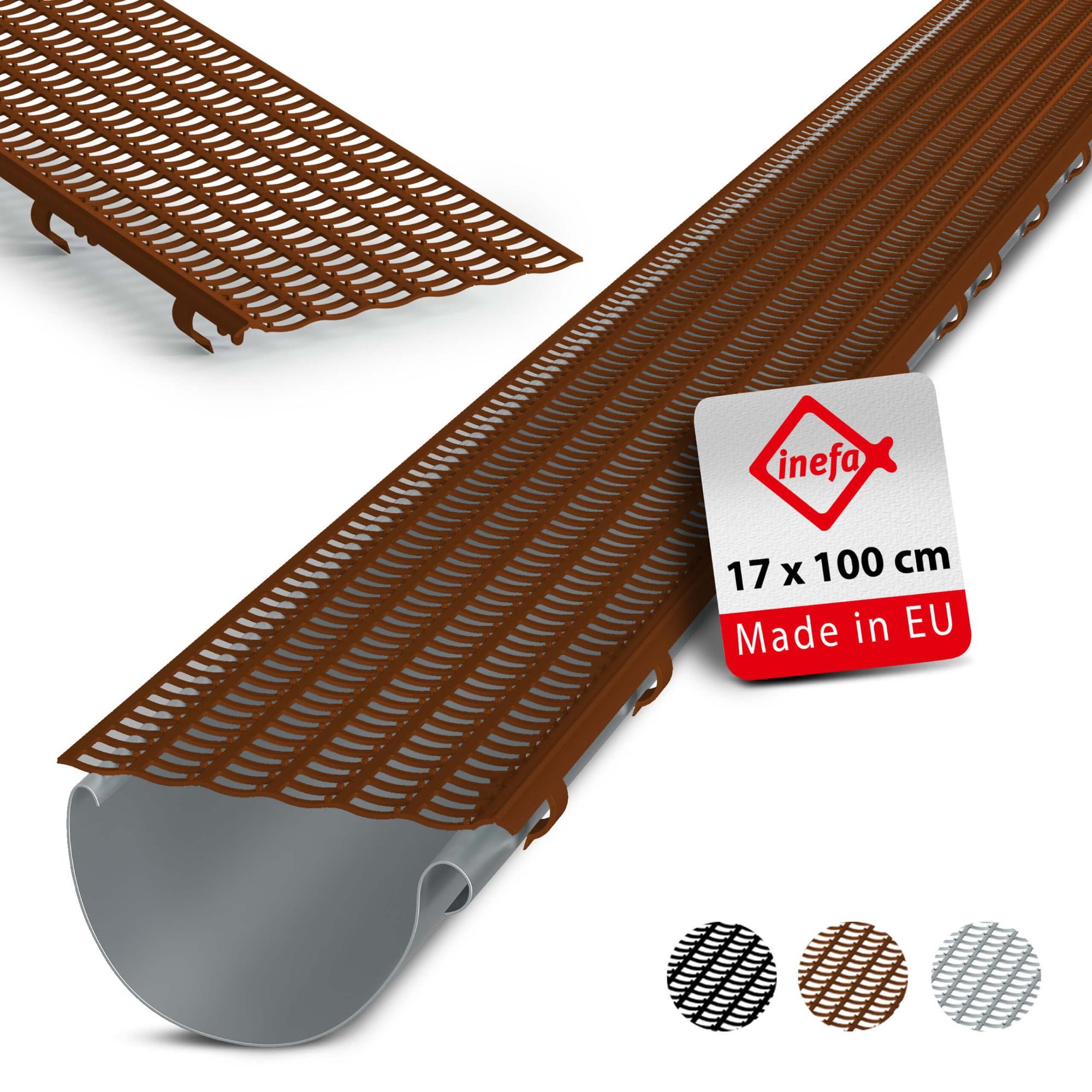 Der Laubfangstreifen NW 100/125/150 in Braun dient dem Schutz der Dachrinne vor Laubverstopfung. Dank des Laubschutzes für Dachrinnen fällt Laub nicht in die Rinne, sondern bleibt auf dem Gitter liegen bis der Wind es getrocknet und weggeweht hat. Der Laubfang Dachrinne ist aus hochwertigem, langlebigem Polyproline gefertigt und zeichnet sich durch besondere Wetterbeständigkeit aus. Aufgrund seiner flachen, unauffälligen Form lässt er sich einfach auf den Rinnenwulst clippen, sodass der Ablauf des Regenwassers nicht beeinträchtigt wird.