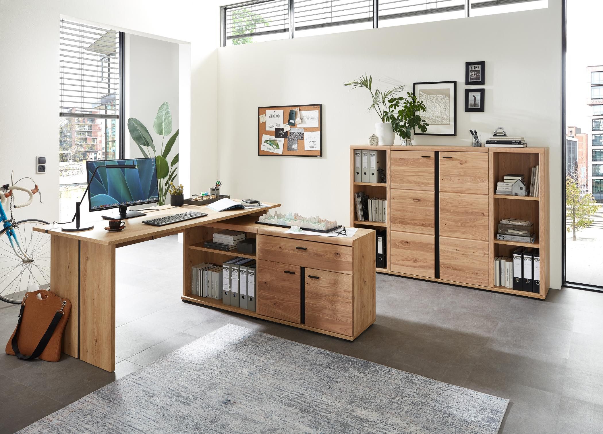 Das Büroset SONOS mit Fronten aus Altesche Massivholz mit gebürsteter Oberfläche und Korpus in Old Artisan Oak Nachbildung ist ein absolutes Highlight für Ihr Büro, die Farbgebung wirkt modern und natürlich zugleich.