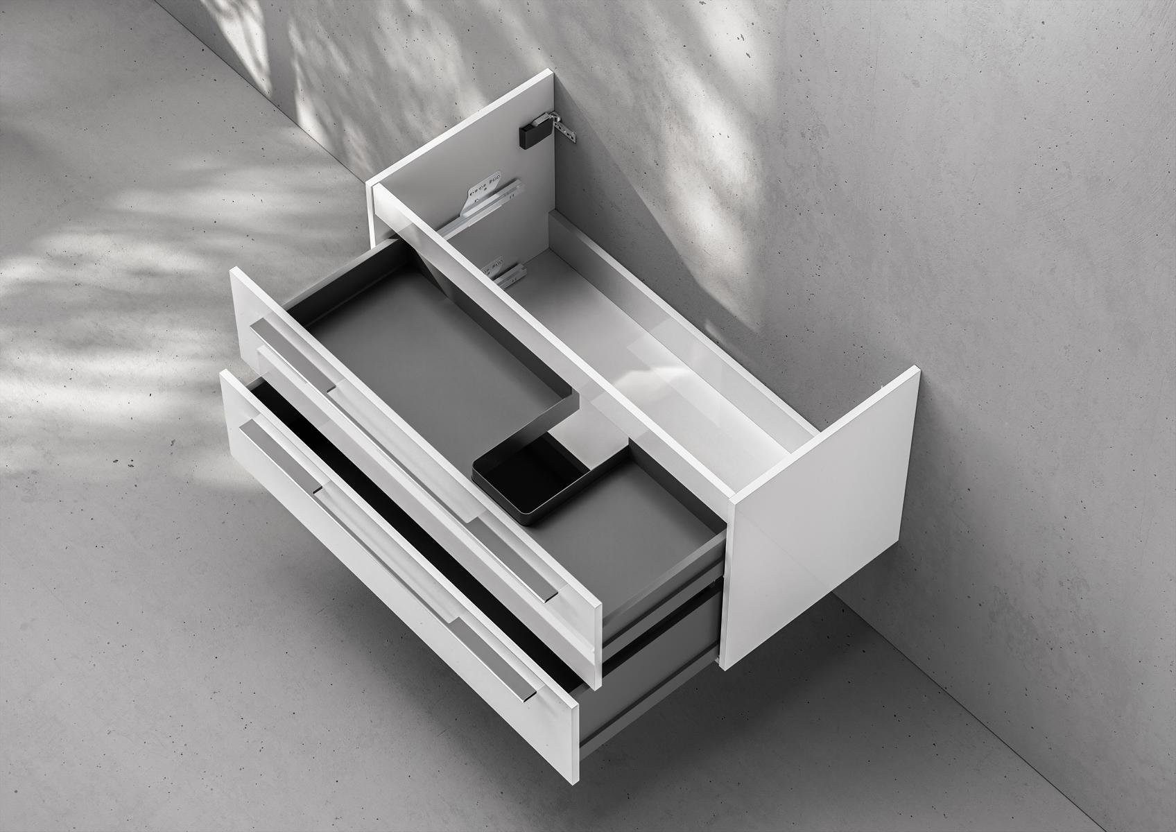 Durch sein zeitloses, elegantes Design harmoniert der Unterschrank stilsicher zu Ihrem Waschtisch Xeno 2 von Geberit. Als Badmöbelhersteller und Direktverkäufer legen wir großen Wert auf die hohe Qualität unserer Bauteile. Deshalb arbeiten wir mit den modernen Auszügen der Marke GRASS Scala in stilvollem Anthrazit Stone. Durch die integrierte Soft-Close-Funktion lassen sich die Schubladen geräuscharm schließen. Der eckige Siphon-Ausschnitt befindet sich analog Ihrer Waschtisch-Armatur links, mittig oder rechts, für Doppelwaschtische sind entsprechend zwei Ausschnitte vorgesehen.