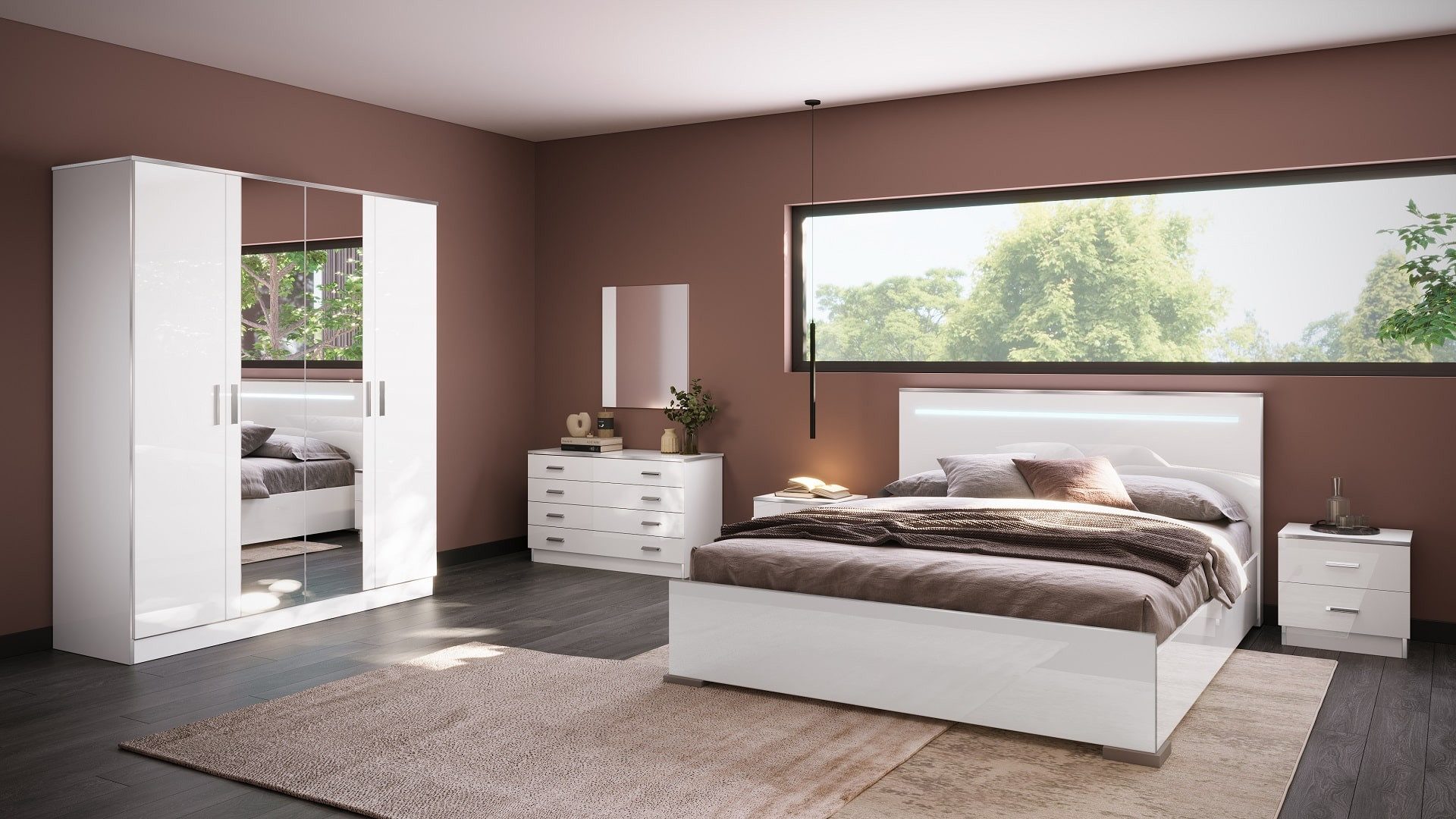 | Set beinhaltet | 1x Kleiderschrank. 1x Bettgestell, 2x Nachtkommode, 1x Wäschekommode, 1x Wandpaneel mit Spiegel |