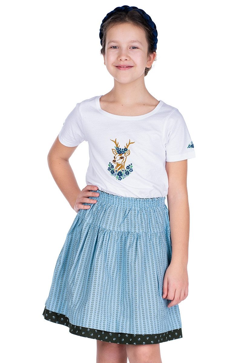 Tiara, der verträumte Mädchen Trachtenrock zum Wenden, wird aus angenehmer Baumwolle gefertigt, ist ausgestellt geschnitten und hat einen breiten Bund mit einem elastischen Gummiband-Einsatz oben. Der Rockteil ist am Bund keck gerafft und schafft so einen tollen Faltenwurf. Durch die Wende-Möglichkeit sind zweierlei Designs in einem Kleidungsstück vereint, somit kann nach Lust und Laune das Dekor gewählt werden. Die hellblaue Seite ist im feinen Streifen-Look, geformt aus stilisierten Ranken und Tupfen in Oliv und Marine, bedruckt und hat einen Rocksaum im Lagen-Look aus Kontraststoff in Tanne mit kleinen Blumen. Auf der andereren Rockseite sind süße, stilisierte Blümchen in Hellblau/Weiß aufgedruckt und den Rockabschluss ziert eine liebliche Häkelspitzenborte. Der Rock für Kleinkinder und Teens passt herrlich zu unseren Kinder-Shirts, -Trachtenblusen und Kleinkind-Bodys. Bitte beachten Sie den Größenzuschlag ab Größe 128.