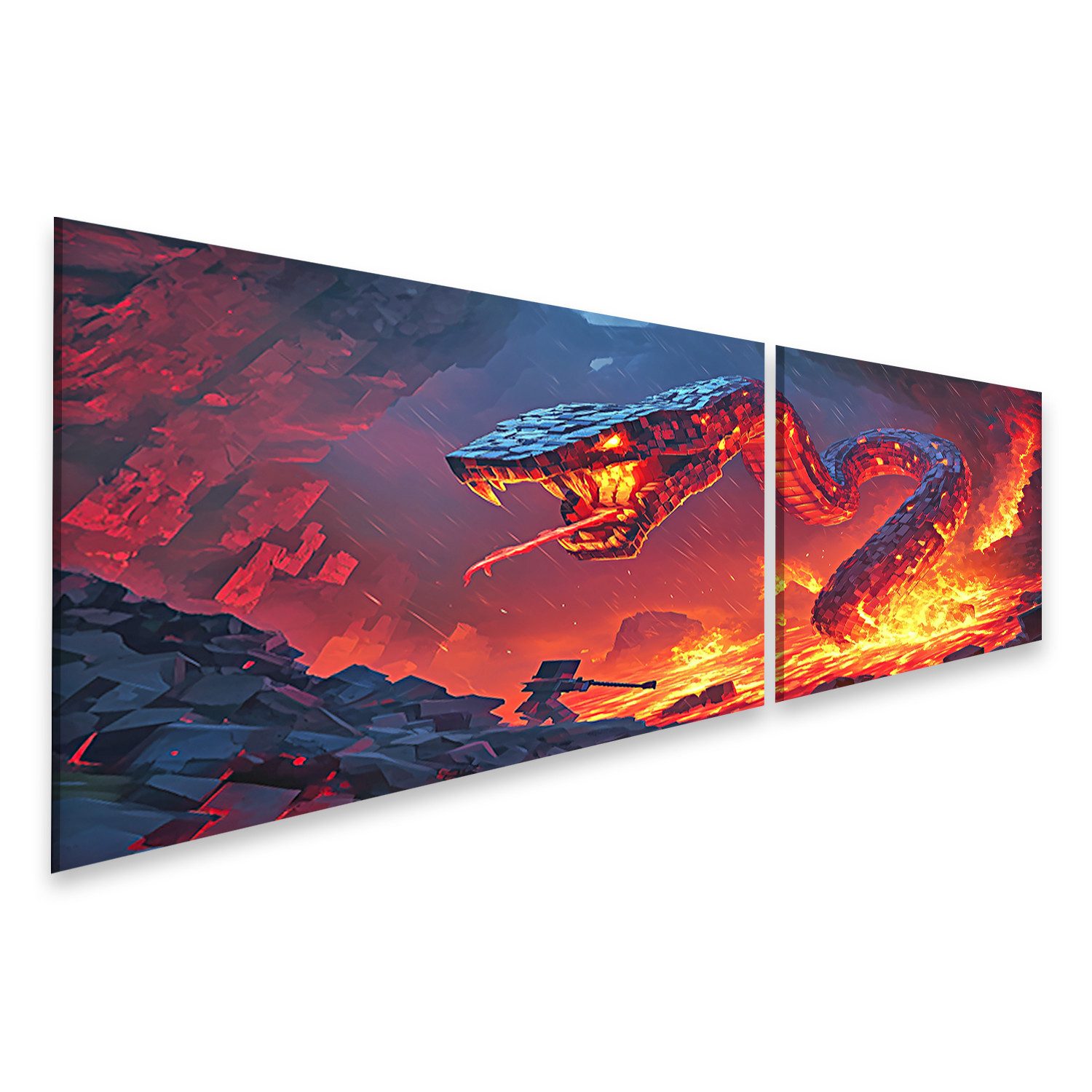Leinwandbild Feuriger Pixel Drache im Lavasturm