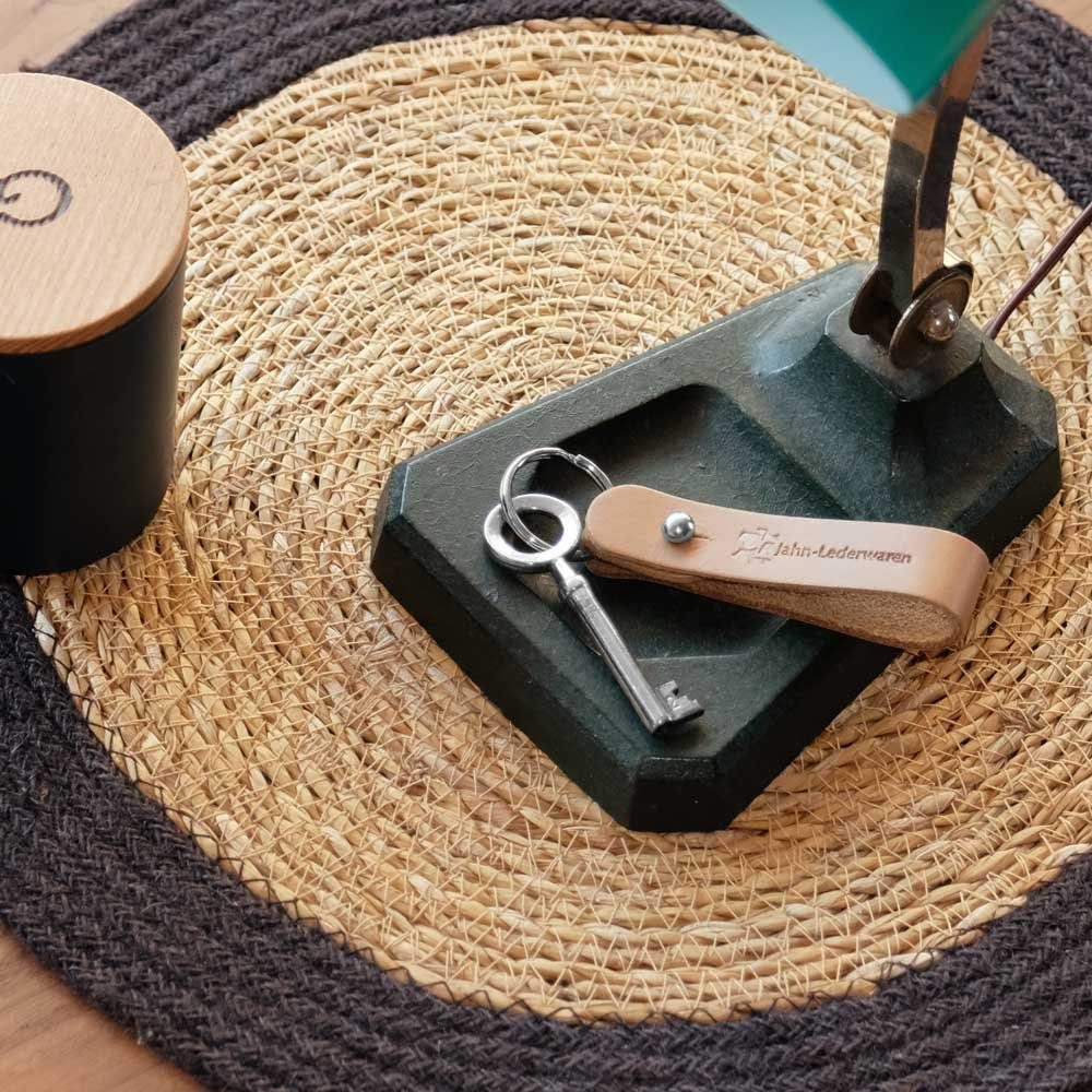 Der Leder-Schlüsselanhänger sieht nicht nur sehr stilvoll aus, sondern hat auch ganz praktische Vorzüge, denn der Schlüsselanhänger wird aus einem deckend gefärbten Büffelleder hergestellt, das besonders robust ist. Dieses spezielle Büffelleder punktet mit seiner extremen Widerständigkeit: Es glänzt durch Abriebfestigkeit, ist besonders lichtecht und ist zusätzlich auch noch wasserabweisend. Insgesamt also ein qualitativ hochwertiges Leder, das sehr langlebig ist. So werden Sie mit Ihrer Leder-Schlüsselanhänger sicher lange Ihre Freude haben.