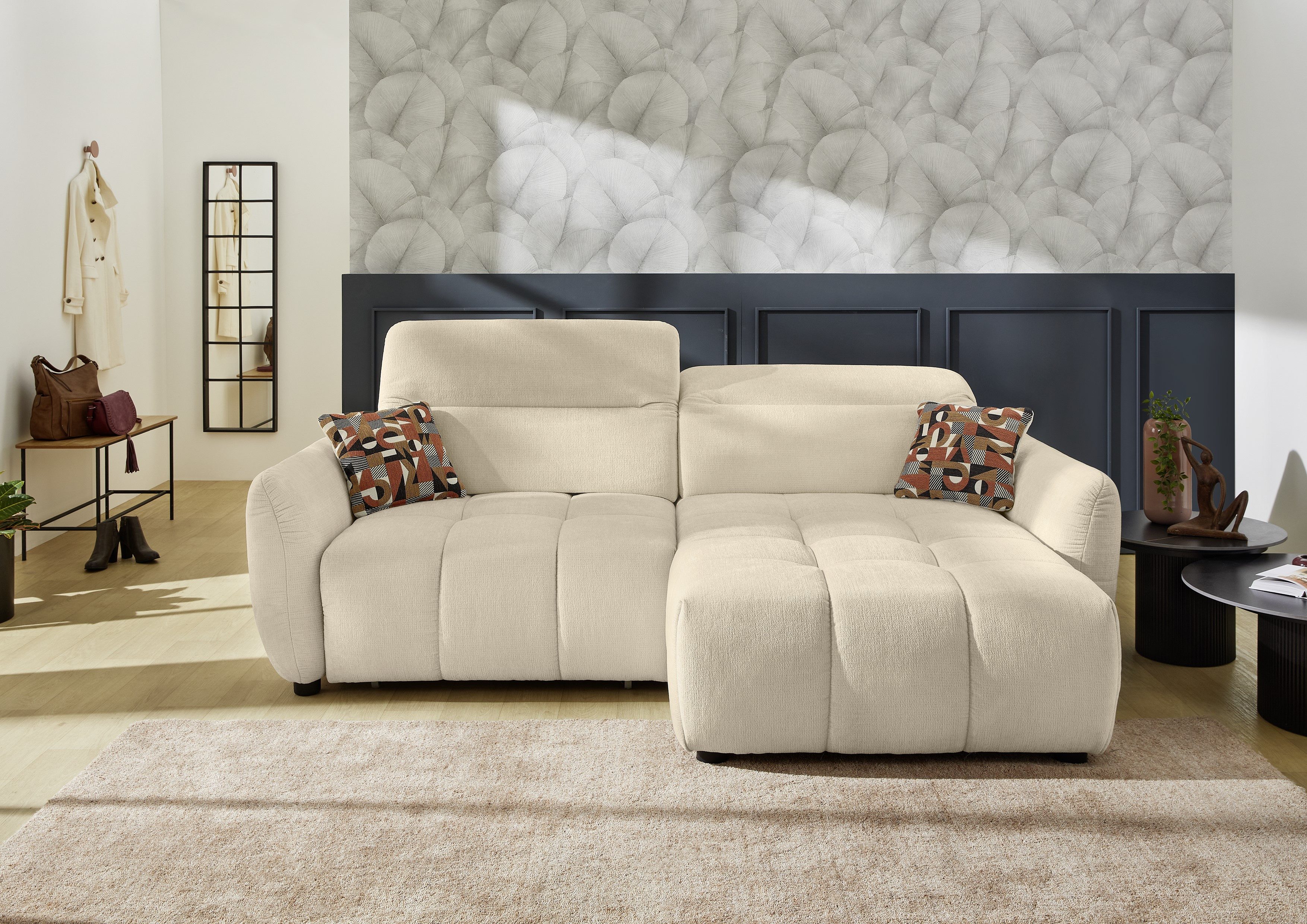 | Wissenswertes | Ultimativer Komfort durch den elektromotorischen 60cm-Auszug und einer Belastbarkeit von 140kg bietet es maximale Bequemlichkeit und langlebige Nutzung. Per Knopfdruck verwandelt sich das Ecksofa in eine großzügige Relax- oder Liegefläche. Durch die Wellenfederung bietet es höchsten Sitzkomfort und modernes Design in einem. Ideal für entspannte Abende. Praktischerweise können über einen USB-A und USB-C Ladeport das Smartphone oder Tablet geladen werden. Für noch mehr Bequemlichkeit können die mehrfach verstellbaren Kopfteilelemente mittels Rasterfunktion positioniert werden. Durch den mit Echtstoff bezogenen Rücken besteht zudem die Möglichkeit die Polsterecke auch „frei im Raum“ zu stellen. Weitere Flexibilität entsteht durch die beidseitig montierbare Ottomane. Die abgestimmten Wende-Zierkissen harmonieren hervorragend mit der restlichen Designsprache des Sofas. Durch die markant tiefen Sitzeinzüge wird es der neue Eyecatcher im Wohnbereich. |