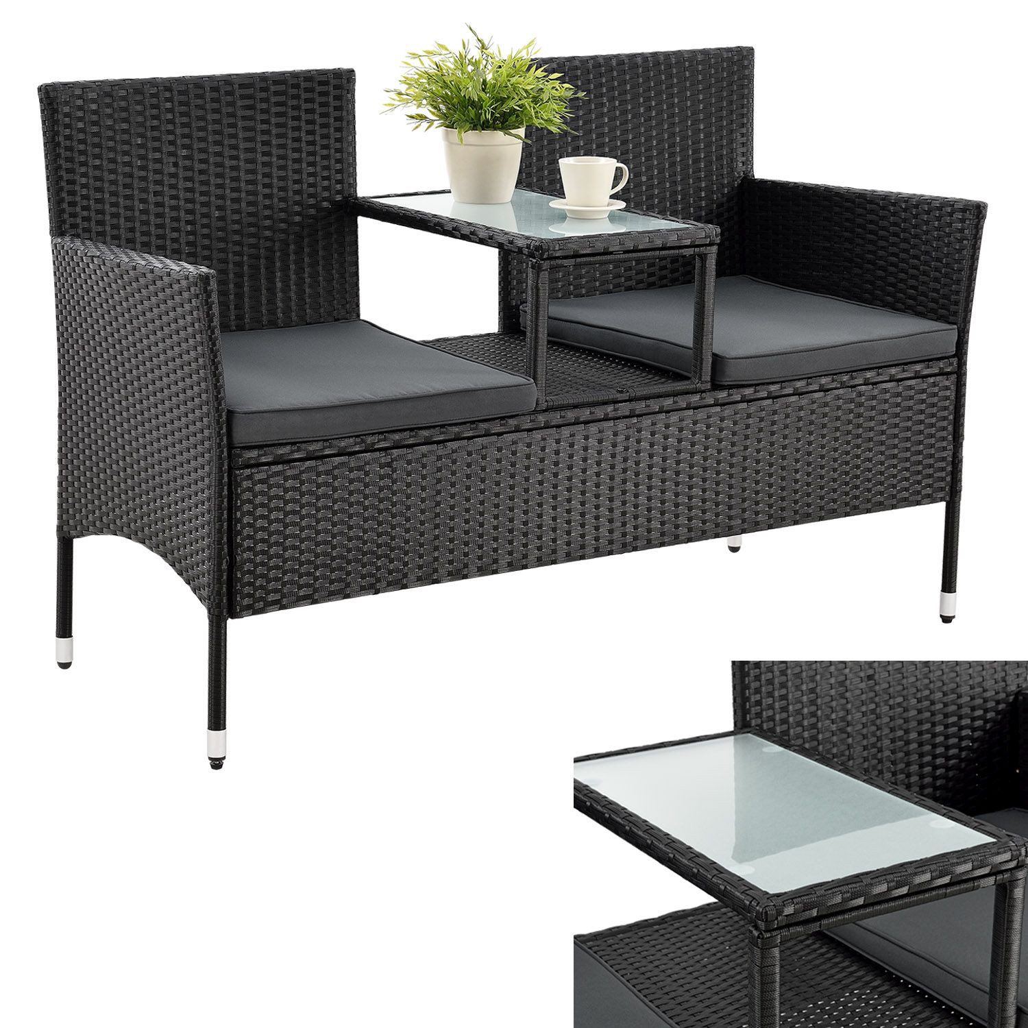 Das Terrassenmöbel-Set verwöhnt Sie mit weichen Polstern und hohen Arm- und Rückenlehnen für maximalen Komfort. Die Sitzgarnitur bietet Platz für 2 Personen und verfügt über einen kleinen Ablagetisch mit einer robusten 5 mm Glasplatte. Dieses Gartenmöbel-Set ist perfekt, um an warmen Sommertagen ein erfrischendes Getränk in Reichweite zu haben. Genießen Sie das Outdoor-Möbel-Set in vollen Zügen!