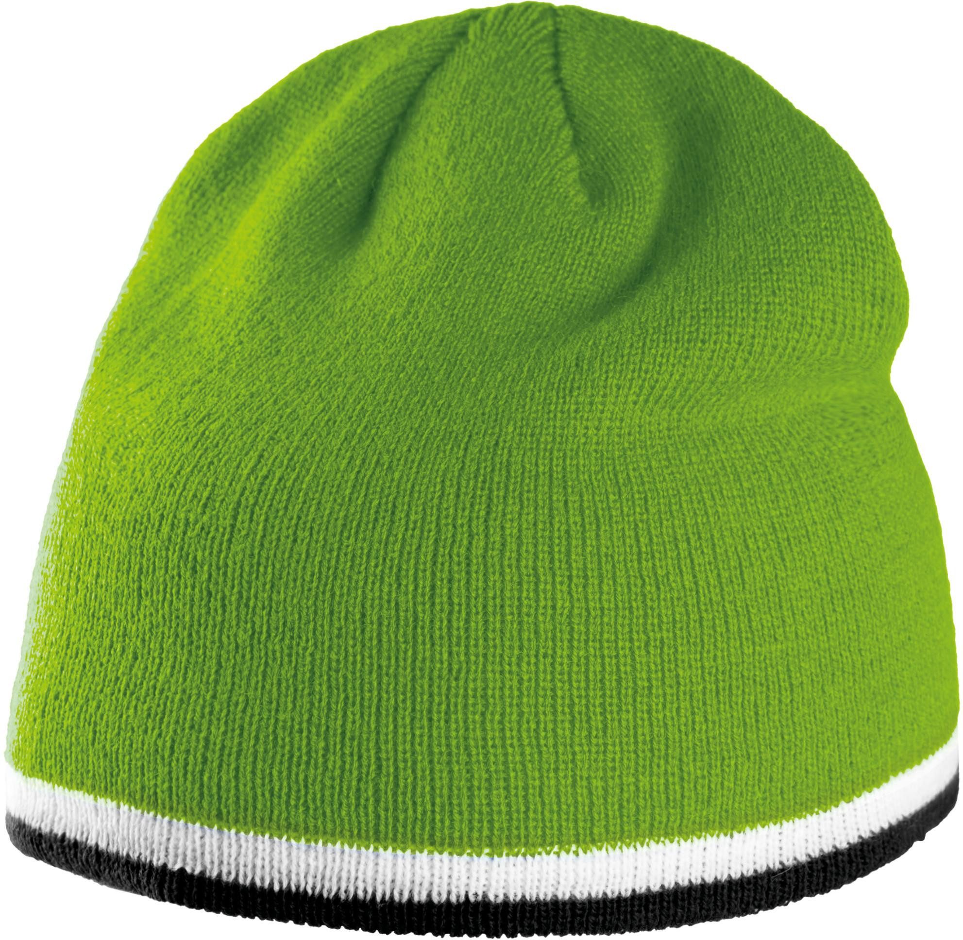 100% Acryl. Strickmütze mit Kontraststreifen am Rand.