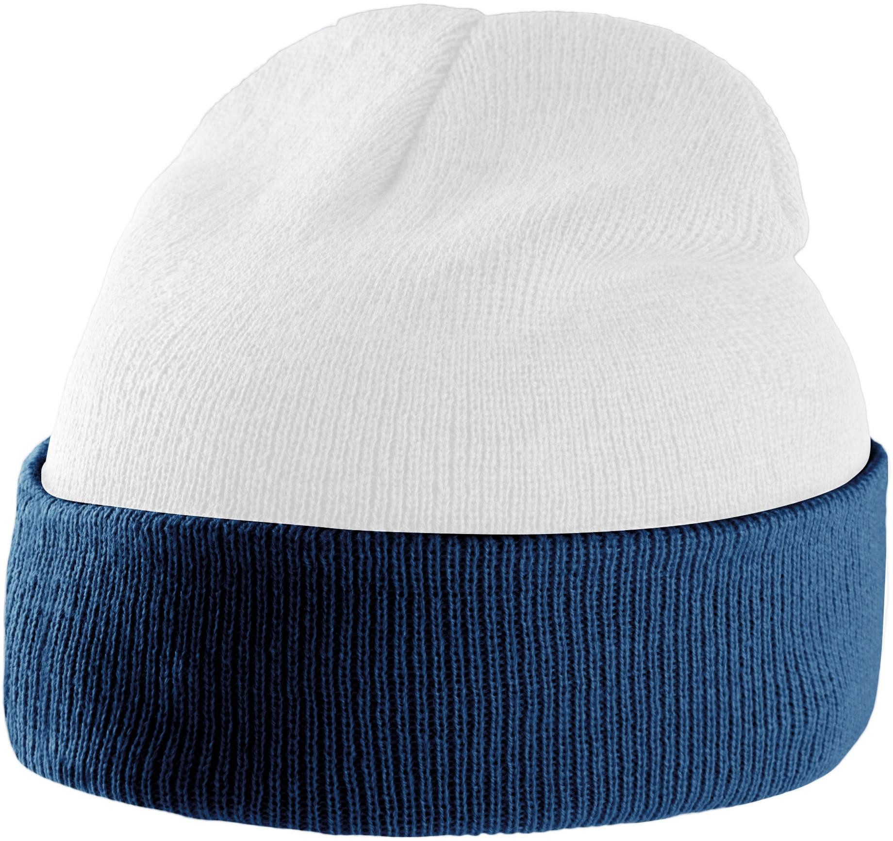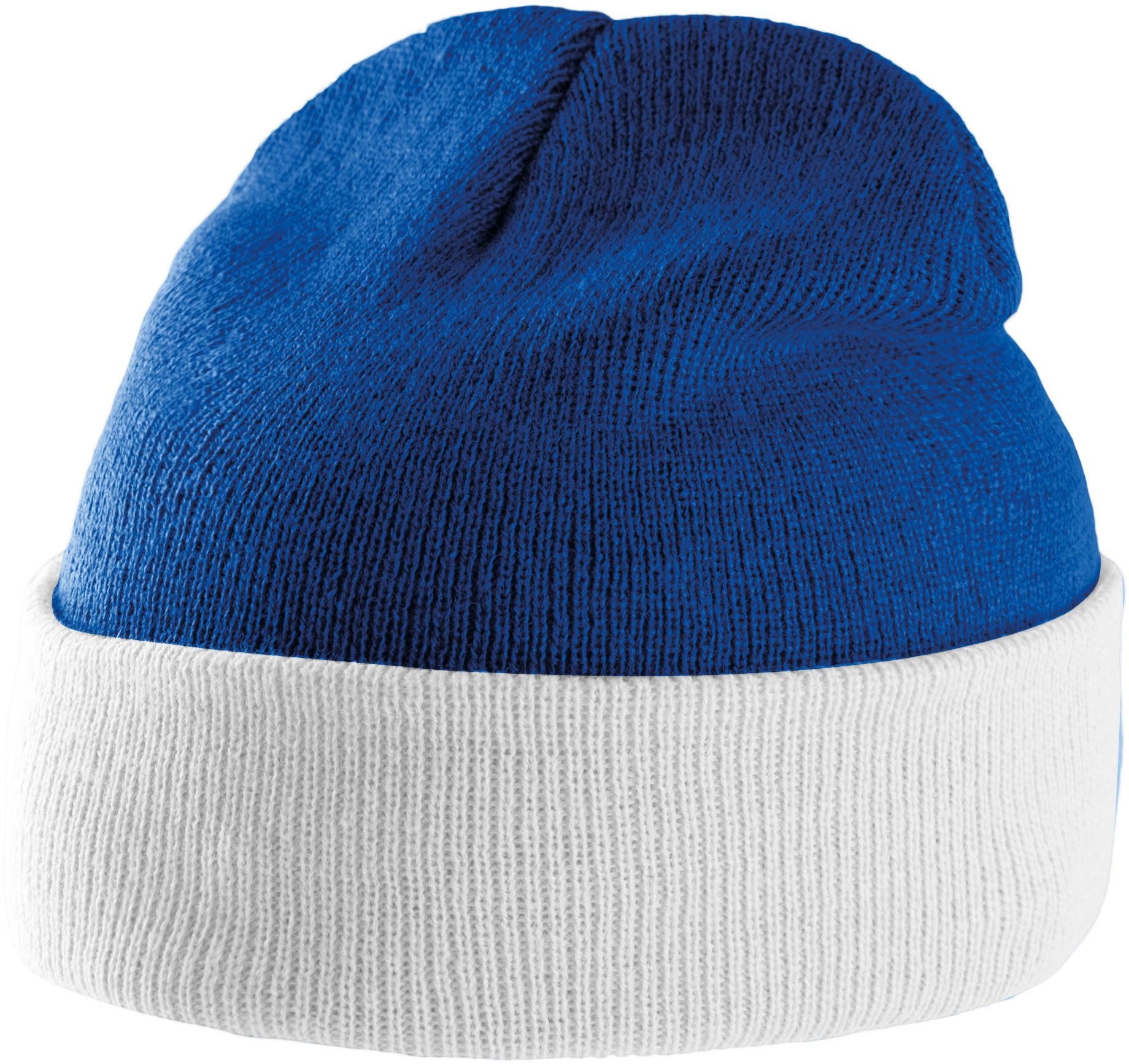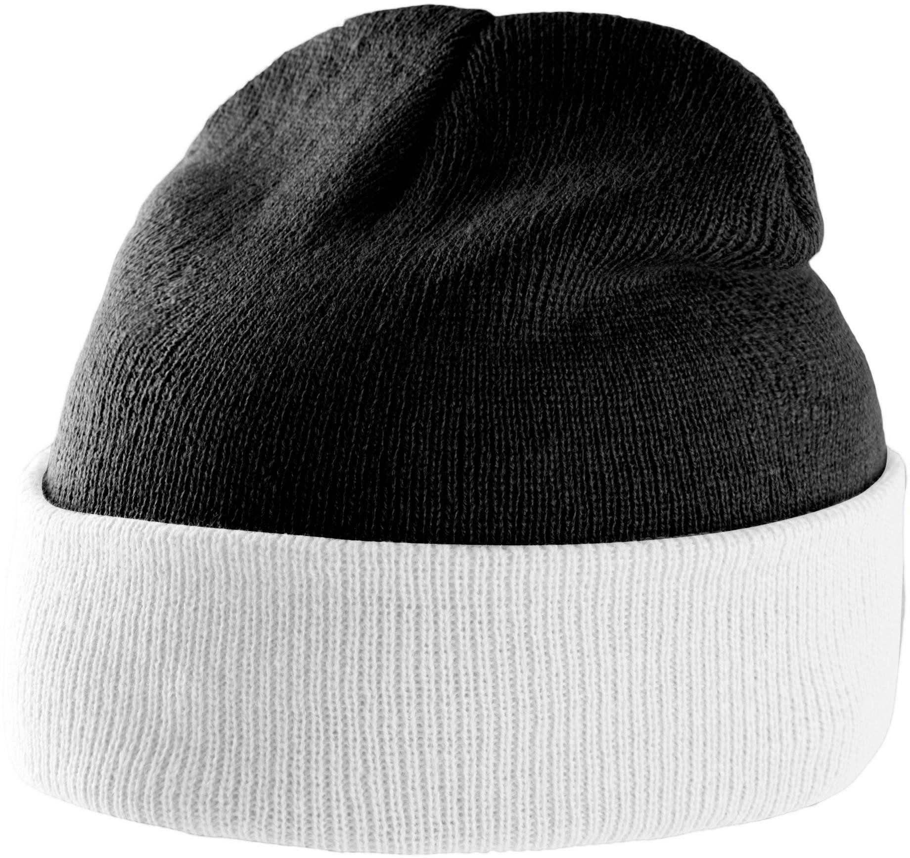 100% Acryl. Modische Mütze mit gestricktem Umschlag in Kontrastfarbe.