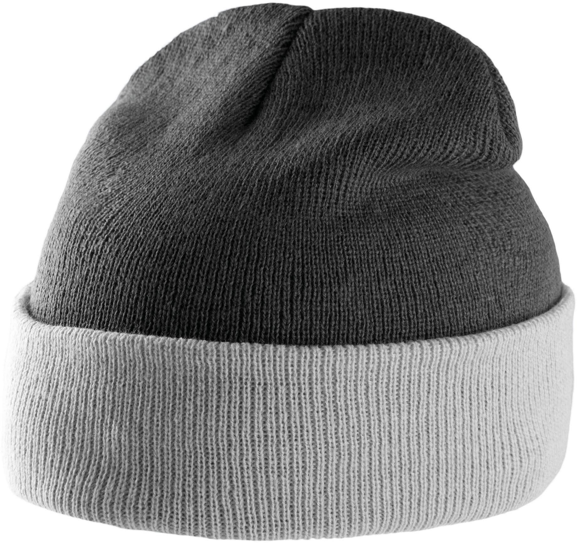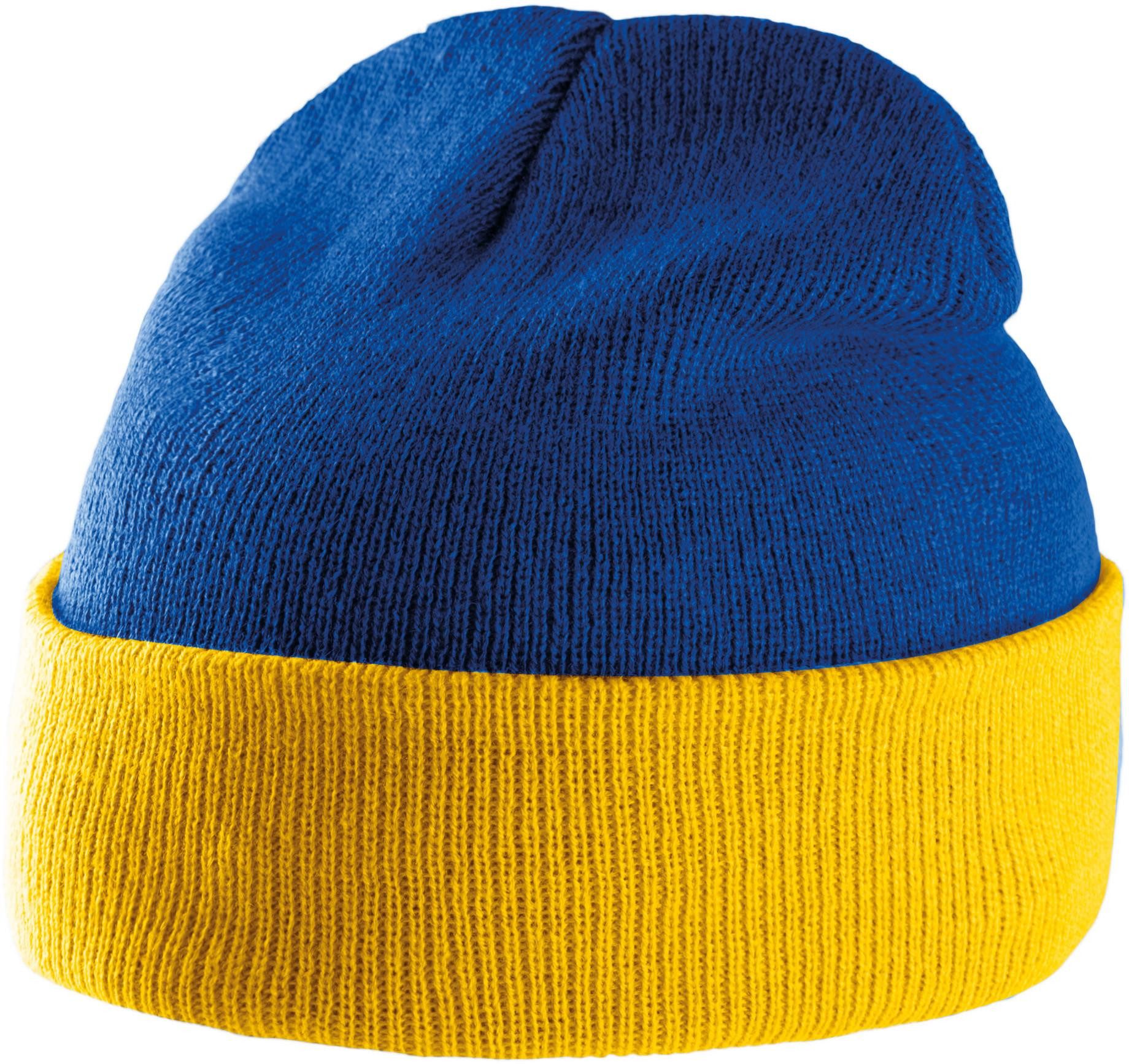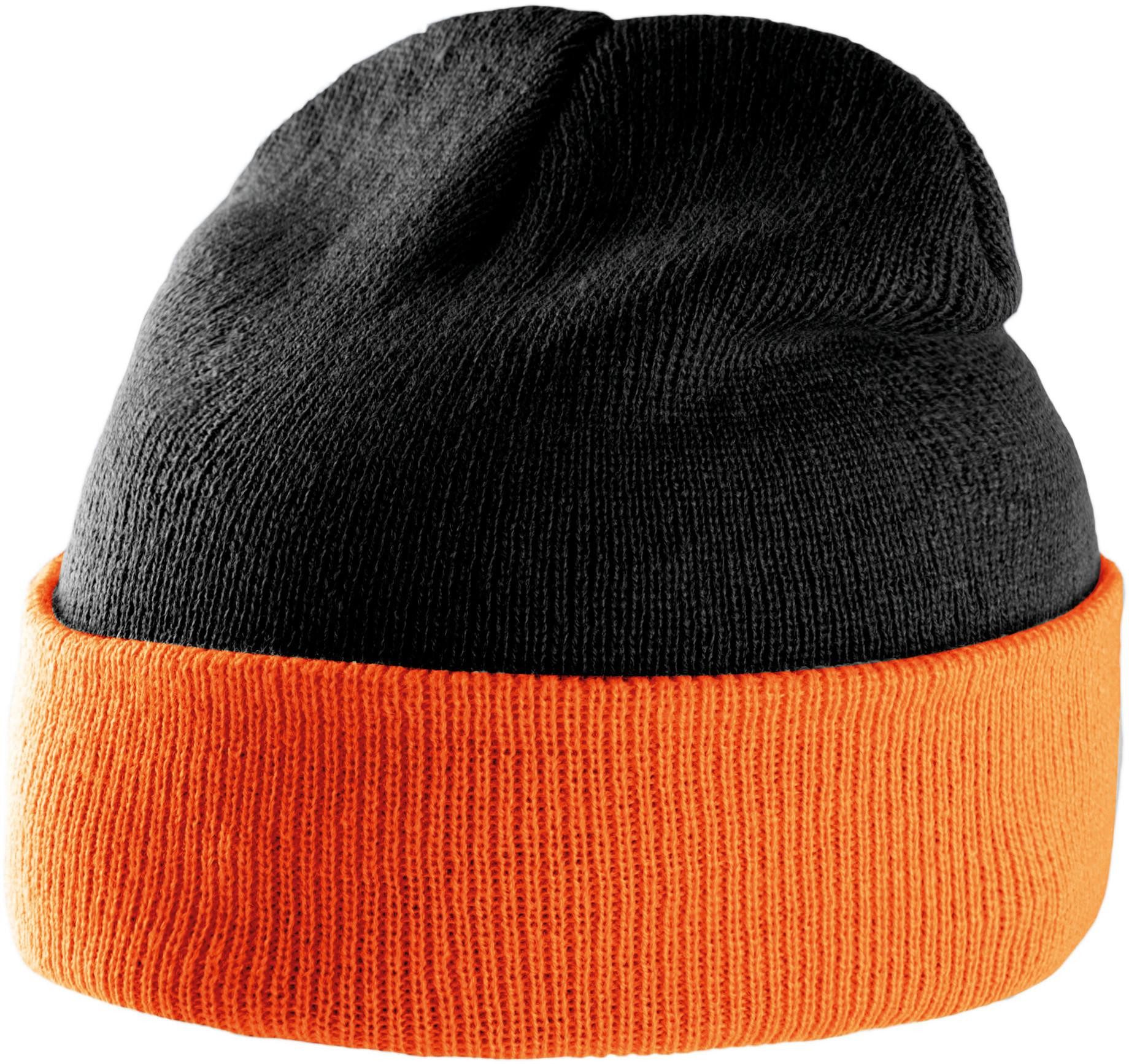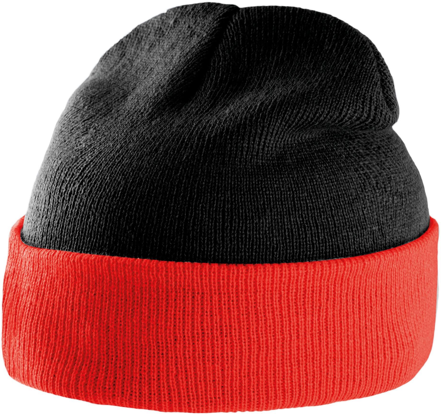100% Acryl. Modische Mütze mit gestricktem Umschlag in Kontrastfarbe.