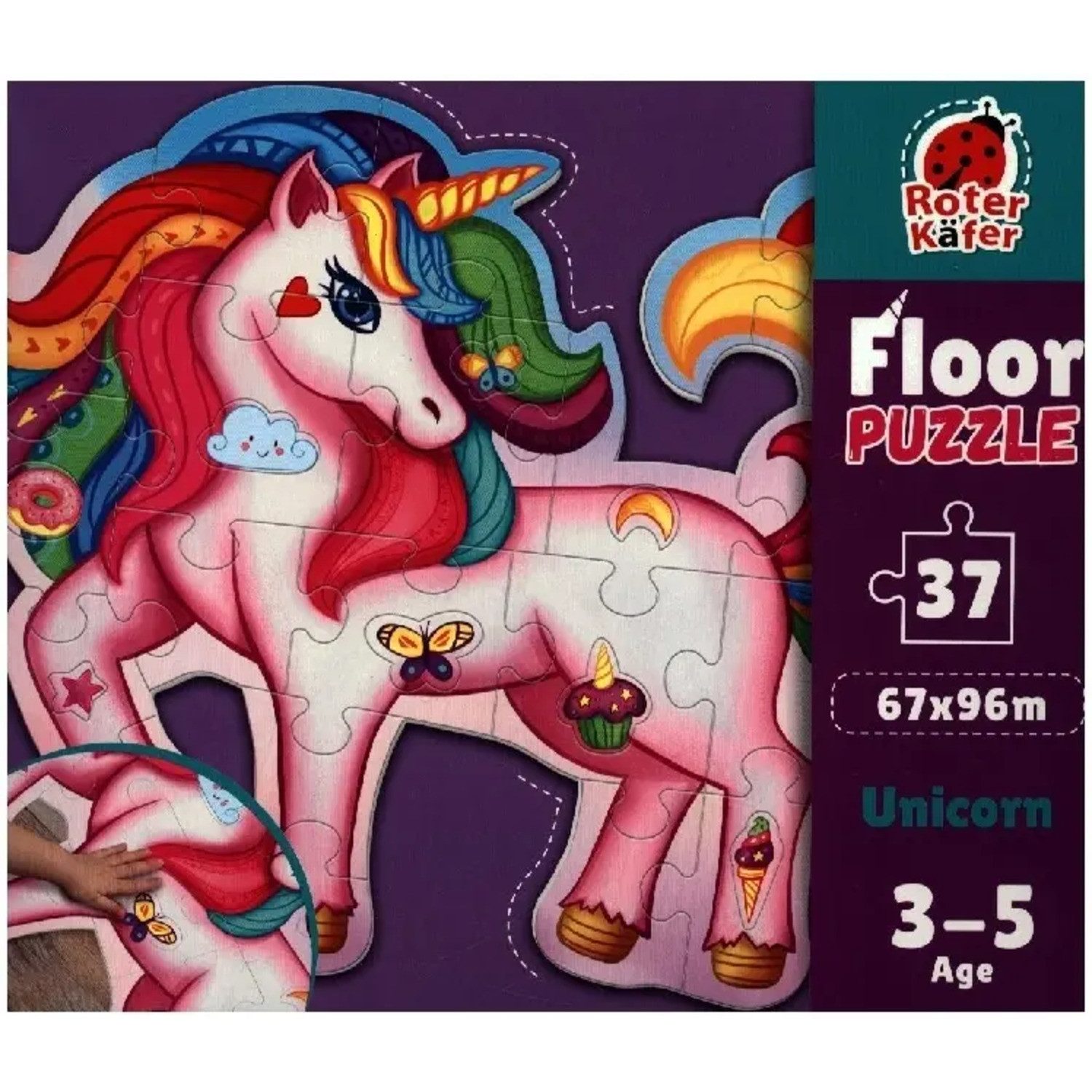Puzzle Roter Käfer Bodenpuzzle Ein magisches Einhorn: Das riesige Einhorn-Abenteuer! Bereite dich auf eine magische Reise in die Welt der Fantasie vor mit unserem riesigen Bodenpuzzle Ein magisches Einhorn! Dieses Puzzle ist eine Einladung in eine Märchenwelt, in der ein wunderschönes Einhorn mit schimmernder Regenbogenmähne und goldenem Schweif dein Kind kennenlernen möchte. Dieses Fabelwesen erhellt jede Spielstunde! Dieses große Kinderpuzzle ist ideal für ein gemeinsames Spielerlebnis. Mit einer beeindruckenden Größe von 67 x 96 cm bietet es viel Platz zum Spielen und Lernen. Das Set enthält 37 große, griffige Puzzleteile, die ein farbenfrohes und detailreiches Bild ergeben. Du kannst deinem Kind von Einhörnern erzählen und gemeinsam neue Geschichten über diese magische Kreatur erfinden. Nachdem das Hauptpuzzle fertig ist, geht das Abenteuer weiter! Dein Kind kann sich in die Welt der fünf zusätzlichen Mini-Puzzles vertiefen. Diese kleineren Puzzles begeistern mit leuchtenden Bildern und zeigen die Lieblingsleckereien des Einhorns: leckere Kekse, einen rosa Donut, bunte Macarons und appetitliche Cupcakes. Ein beiliegendes Poster hilft beim Zusammensetzen und erweitert das Wissen. Die Puzzleteile sind ideal für kleine Hände, wodurch sie sicher und einfach zu handhaben sind. Die praktische Aufbewahrungsbox sorgt für Ordnung nach dem Spiel. Es ist die perfekte Wahl für jeden kleinen Einhorn-Fan und eine tolle Möglichkeit, manuelle Fähigkeiten, Konzentration und visuelles Gedächtnis zu entwickeln. Unser Puzzle garantiert stundenlangen, fesselnden und lehrreichen Spielspaß!