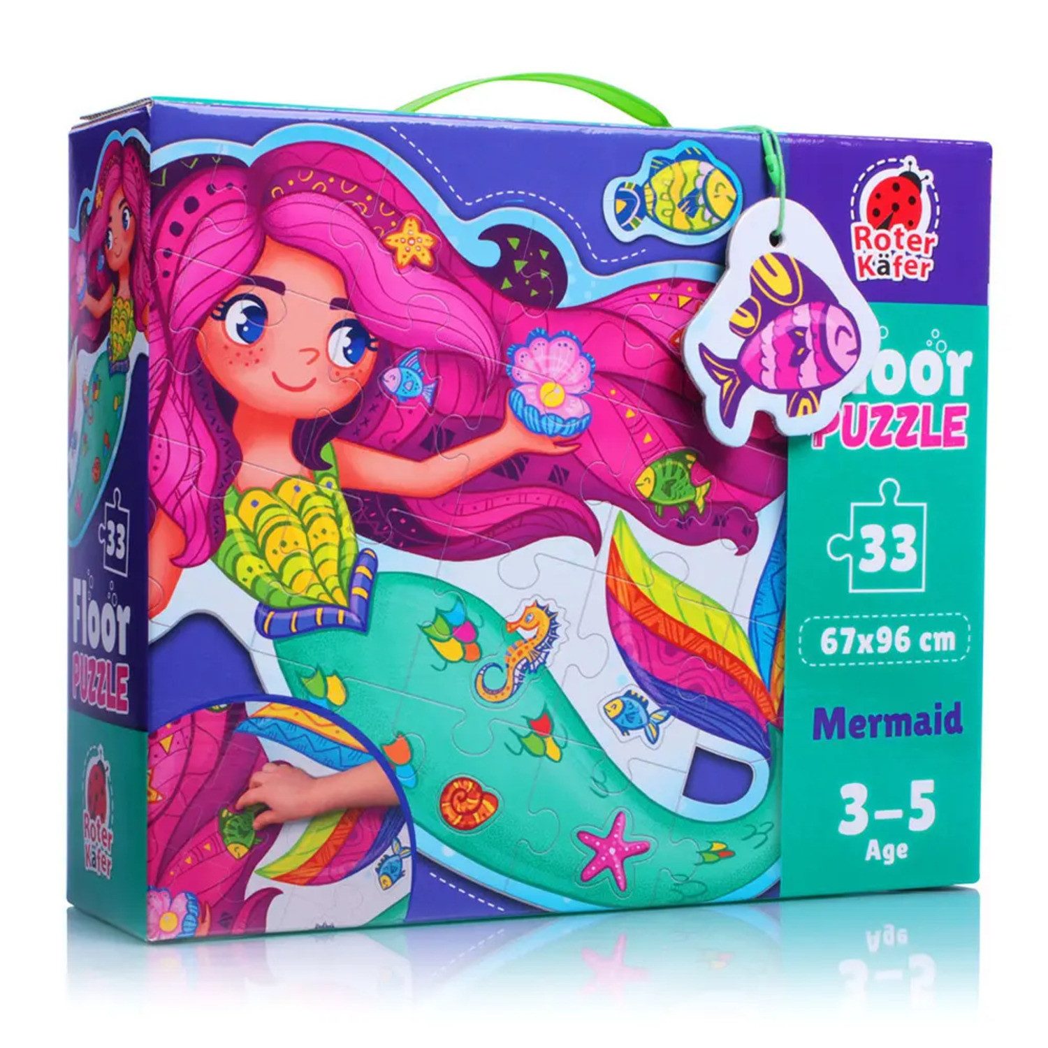 Puzzle Roter Käfer Bodenpuzzle Meerjungfrau: Das riesige Unterwasser-Abenteuer! Bereite dich auf eine magische Reise in ein Königreich voller Abenteuer vor mit unserem riesigen Bodenpuzzle Meerjungfrau! Dieses Puzzle ist mehr als nur eine einfache Beschäftigung, es ist eine Einladung in eine Märchenwelt, in der eine wunderschöne Meerjungfrau und ihre Unterwasserfreunde auf dein Kind warten. Die lächelnde Meerjungfrau mit ihrem schimmernden Schwanz und langen, wallenden Haaren ist eine wahre Zierde der Unterwasserwelt. Dieses große Kinderpuzzle ist das ideale Spiel, um es gemeinsam zu lösen. Als Eltern könnt ihr aktiv mitmachen und eurem Kind die fantastische Welt der Meerjungfrauen näherbringen. Mit einer beeindruckenden Größe von 67 x 96 cm bietet das Puzzle jede Menge Platz zum Spielen und Lernen auf dem Boden. Das Set enthält 33 große, griffige Puzzleteile, die ein farbenfrohes und detailreiches Bild ergeben. Dein Kind wird mit Begeisterung dieses Bodenpuzzle zusammensetzen und sich dann in die Welt der drei zusätzlichen Mini-Puzzles vertiefen. Diese kleineren Puzzles begeistern ebenfalls mit leuchtenden Bildern von einem süßen Seepferdchen, einer schönen Muschel und einem bunten Fisch, die die Unterwassergeschichte bereichern. Ein beiliegendes Poster erleichtert das Zusammensetzen und erweitert das Wissen über die magische Unterwasserwelt. Die Puzzleteile sind ideal für kleine Hände, wodurch sie sicher und einfach zu handhaben sind. Die praktische Aufbewahrungsbox sorgt für Ordnung nach dem Spiel. Es ist die perfekte Wahl für jeden kleinen Meerjungfrauen-Fan und eine tolle Möglichkeit, manuelle Fähigkeiten, Konzentration und visuelles Gedächtnis zu entwickeln. Unser Puzzle garantiert stundenlangen, fesselnden und lehrreichen Spielspaß!