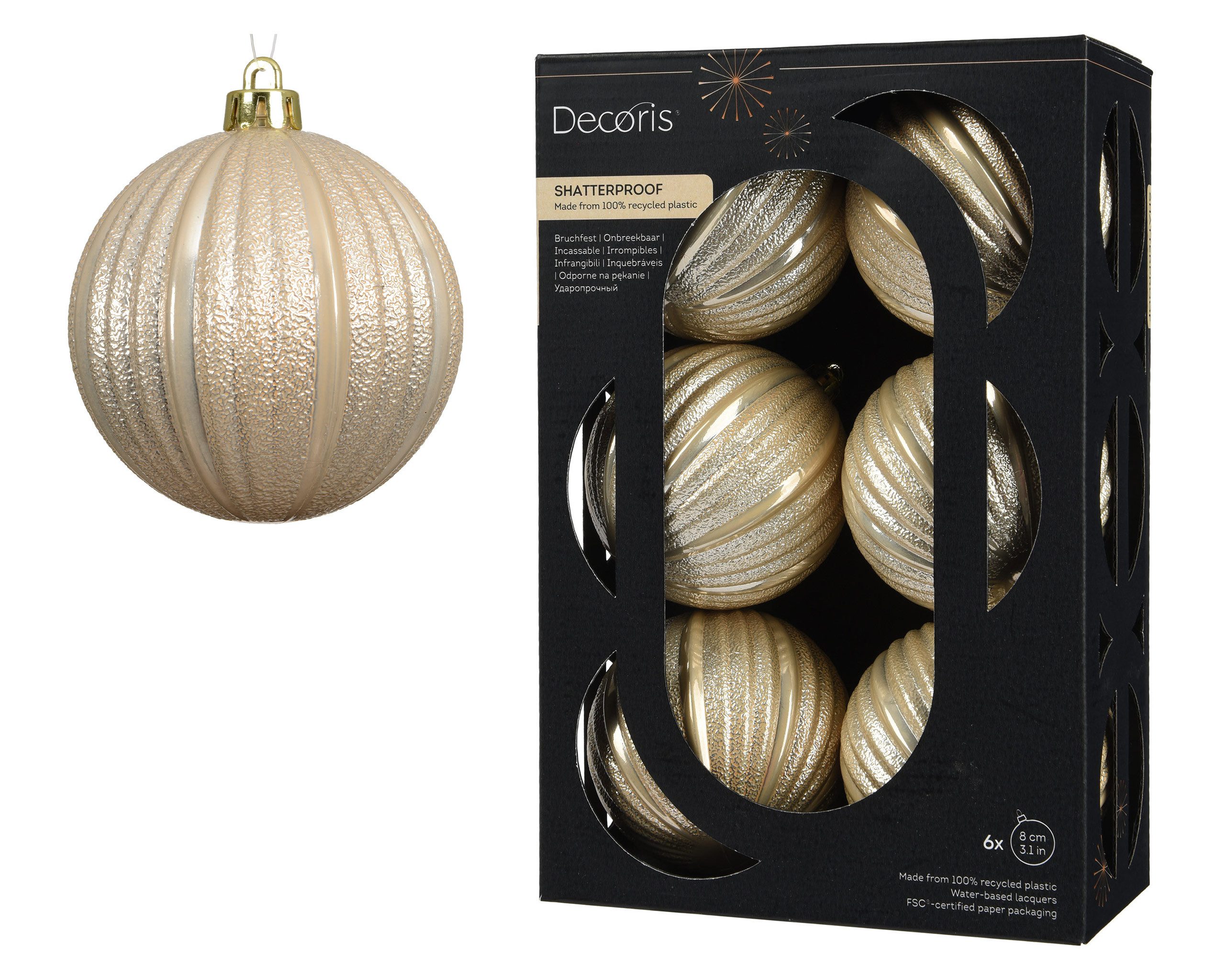 PRODUKT: Weihnachtskugeln mit Rillen / DURCHMESSER: ca. 8 cm / MATERIAL: Kunststoff - Plastik / Inhalt: 6 Kugeln / Farbton: champagner