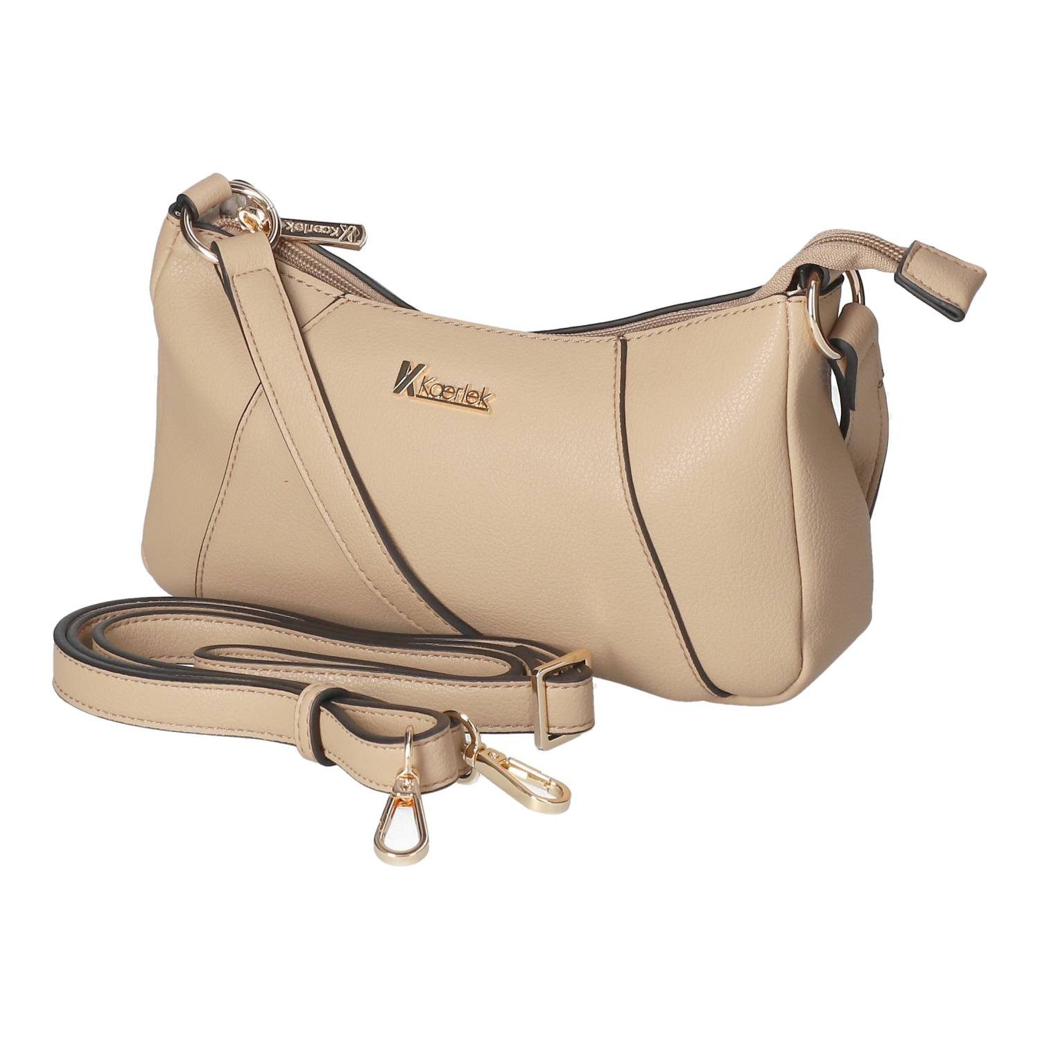 Die Kaerlek Damen Handtasche/Schultertasche aus taupefarbenem Kunstleder vereint schlichte Eleganz mit Funktionalität. Das Markenlabel auf der Vorderseite und goldglänzende Highlights unterstreichen den edlen Look der Tasche. Ein fester Tragehenkel und ein zusätzlicher, abnehmbarer Schultergurt (ca. 150 cm) bieten flexible Tragemöglichkeiten, während der verstärkte Boden für Stabilität sorgt. Ein hinteres Reißverschlussaußenfach ermöglicht schnellen Zugriff auf kleinere Utensilien. Das Reißverschlusshauptfach ist mit einem Steckfach und einem Reißverschlussfach ausgestattet und bietet genügend Platz für persönliche Essentials. Mit kompakten Maßen von ca. 13 x 24 x 5 cm (HxBxT) eignet sich diese Tasche hervorragend für den Alltag und setzt stilvolle Akzente bei jedem Outfit.