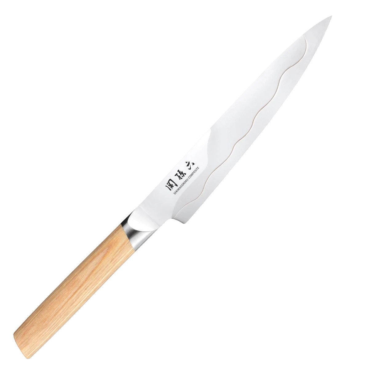 Das KAI Seki Magoroku Composite MGC-0401 Allzweckmesser vereint traditionelle japanische Handwerkskunst mit modernem Design. Die Klinge besteht aus einer einzigartigen Kombination von VG-MAX und SUS42012 Stahl, verbunden durch eine spezielle Kupferlötung. Dies verleiht der 15 cm langen Klinge außergewöhnliche Festigkeit und Präzision, während die sichtbare Kupferlinie einen besonderen visuellen Akzent setzt. Der Griff aus hellem Pakka-Holz mit symmetrischer Form sorgt für Komfort und einfache Handhabung. Das Messer, Sieger des 'reddot design award' 2013, ist leicht und dynamisch, ideal für vielseitige Küchenaufgaben. Mit einer Klingenhärte von 61 HRC und einer Klingendicke von 1,5 mm ist es perfekt für präzises Schneiden. Hergestellt in Japan, steht es für Qualität und Langlebigkeit.