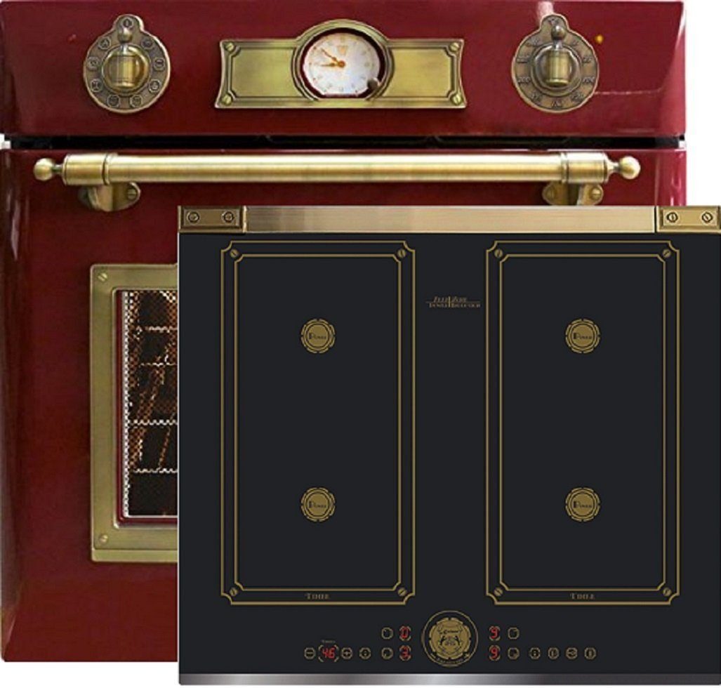 Die flachen einteiligen Kochfelder mit leicht abgeschrägten Kanten und einer Facette vorne verfügen über ein elegantes Design mit zahlreichen Art Déco Dekorelementen wie die Beschläge aus massivem Metall der Antik-Goldtönen, das Ihrer Küche einen exklusiven Stil verleiht.