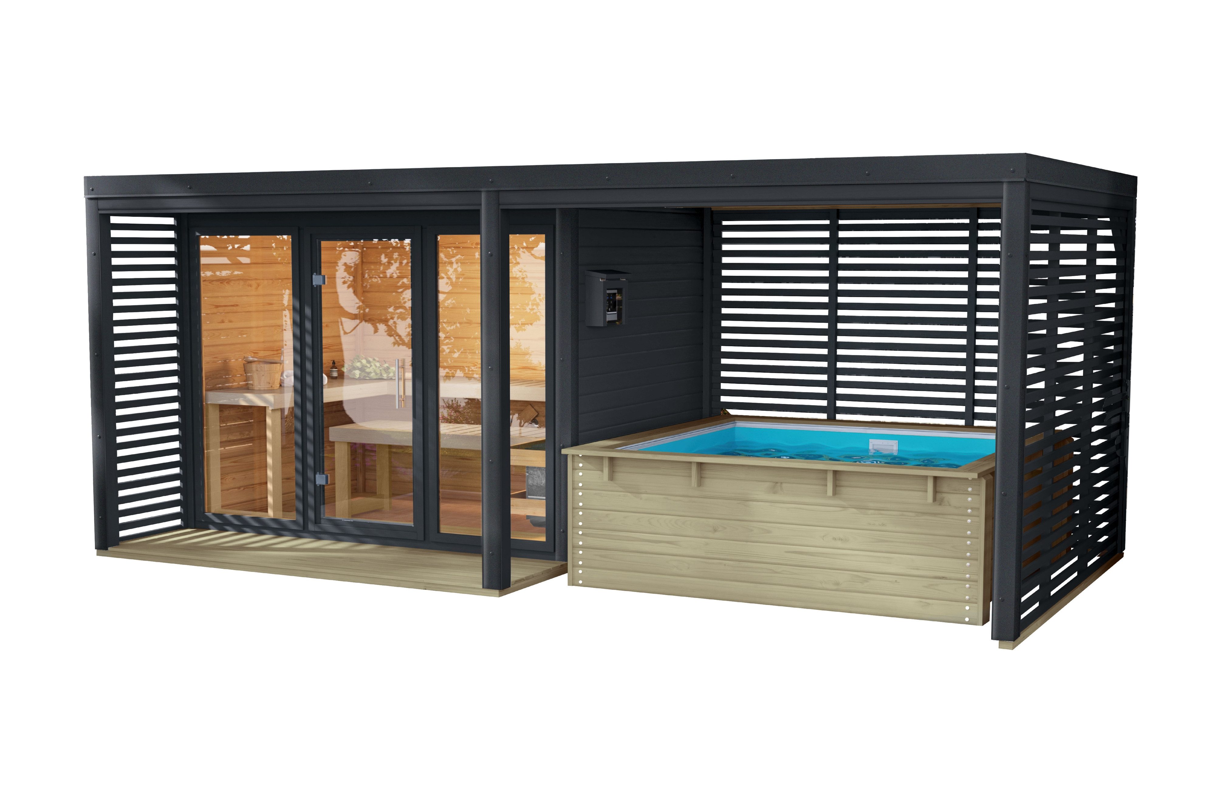 Saunahaus Angelus XL mit Anbaudach und Minipool - Ihre ganz persönliche Wellnessoase - all inclusive.