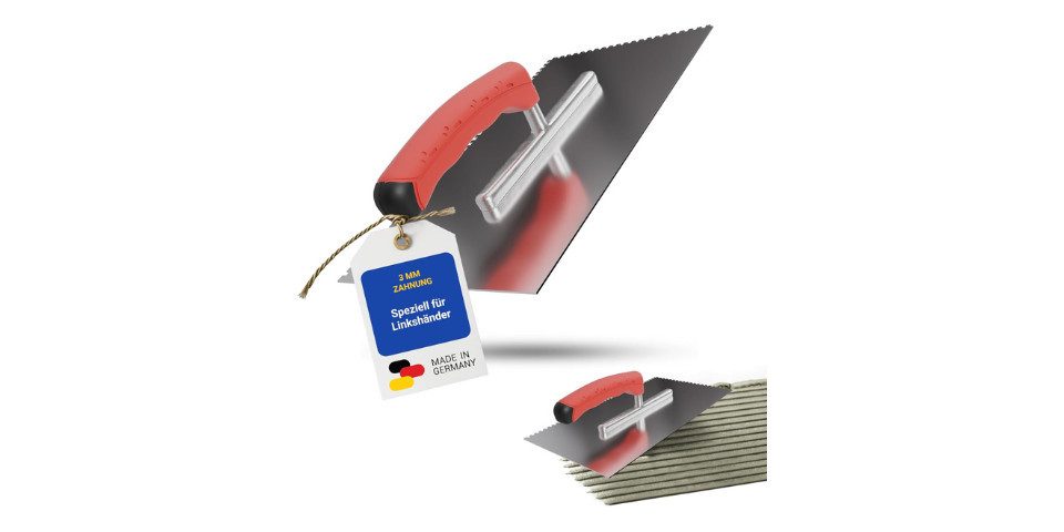 Karl Dahm Zahnkelle für Linkshänder – Präzision und Komfort vereint Die Karl Dahm Zahnkelle mit 3 mm Zahnung wurde speziell für Linkshänder entwickelt und bietet höchsten Komfort sowie präzise Ergebnisse bei Fliesen- und Klebearbeiten. Dieses Profi-Werkzeug ist ideal für Handwerker, die Wert auf Qualität und Funktionalität legen. Speziell für Linkshänder Diese Zahnkelle wurde speziell auf die Bedürfnisse von Linkshändern abgestimmt. Sie ermöglicht eine bequeme Handhabung und optimale Kontrolle, um professionelle Ergebnisse zu erzielen. Ergonomischer Softgriff Der ergonomisch geformte Softgriff sorgt für ermüdungsfreies Arbeiten, selbst bei längeren Einsätzen. Perfekt für eine angenehme und effiziente Handhabung. Perfekte Präzision bei jedem Einsatz Mit der feinen 3 mm Zahnung ist die Kelle ideal für das Auftragen von Kleber auf feine Flächen. Sie gewährleistet gleichmäßige Ergebnisse bei Wand- und Bodenverlegungen. Kompakt und praktisch Die Größe von 13 x 28 cm macht die Zahnkelle zu einem präzisen und vielseitigen Werkzeug. Sie ermöglicht das gleichmäßige Auftragen von Klebstoffen und ist ideal für anspruchsvolle Arbeiten. Deutsche Qualität seit 1956 Vertrauen Sie auf die bewährte Qualität von Karl Dahm, einem Familienunternehmen mit über 60 Jahren Erfahrung in der Herstellung von professionellen Werkzeugen. Mit dieser Zahnkelle entscheiden Sie sich für ein langlebiges Produkt, das höchsten Ansprüchen gerecht wird. Fazit: Die Karl Dahm Zahnkelle für Linkshänder überzeugt durch ihre ergonomische Form, präzise Zahnung und hochwertige Verarbeitung. Ein unverzichtbares Werkzeug für professionelle Handwerker, die auf Qualität und Komfort setzen. Perfekt für alle, die präzise und effizient arbeiten möchten.