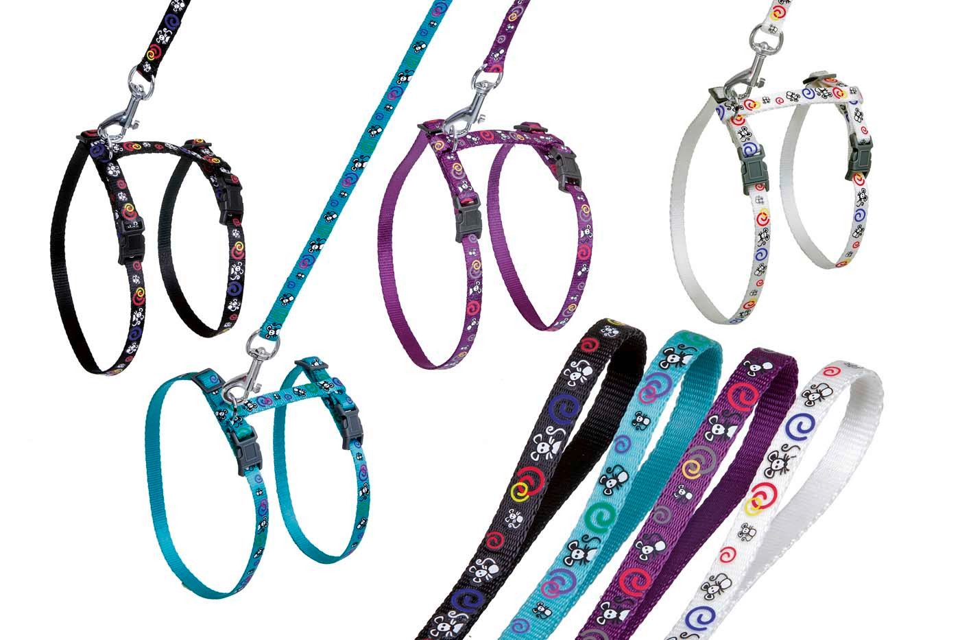 Katzengeschirr mit Leine, stufenlos verstellbar, mit Klickverschluss.