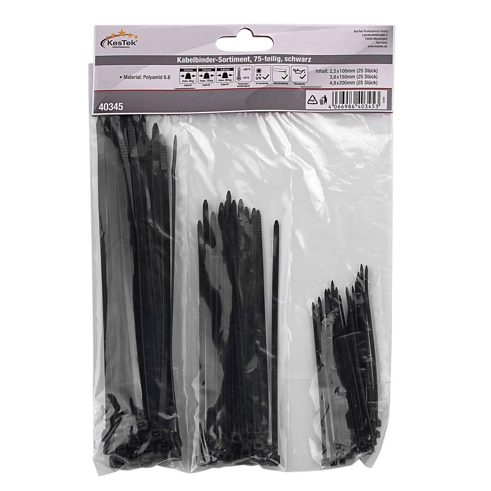 Original KesTek Kabelbindersortiment 75-teilig in schwarz. KesTek Kabelbinder sind robust, vielseitig und ideal für eine Vielzahl von Befestigungsmöglichkeiten. Egal ob im Heimwerkerbereich, im Büro oder in der Industrie, diese Kabelbinder bieten eine einfache und effiziente Lösung für Ihr Kabelmanagement. Unsere Kabelbinder in Industriequalität bestehen komplett aus hochwertigem Polyamid 6.6. Die Innenverzahnung garantiert einen sicheren Halt am Bündelgurt. Sie können einfach per Hand oder mit einer Zange festgezogen werden.