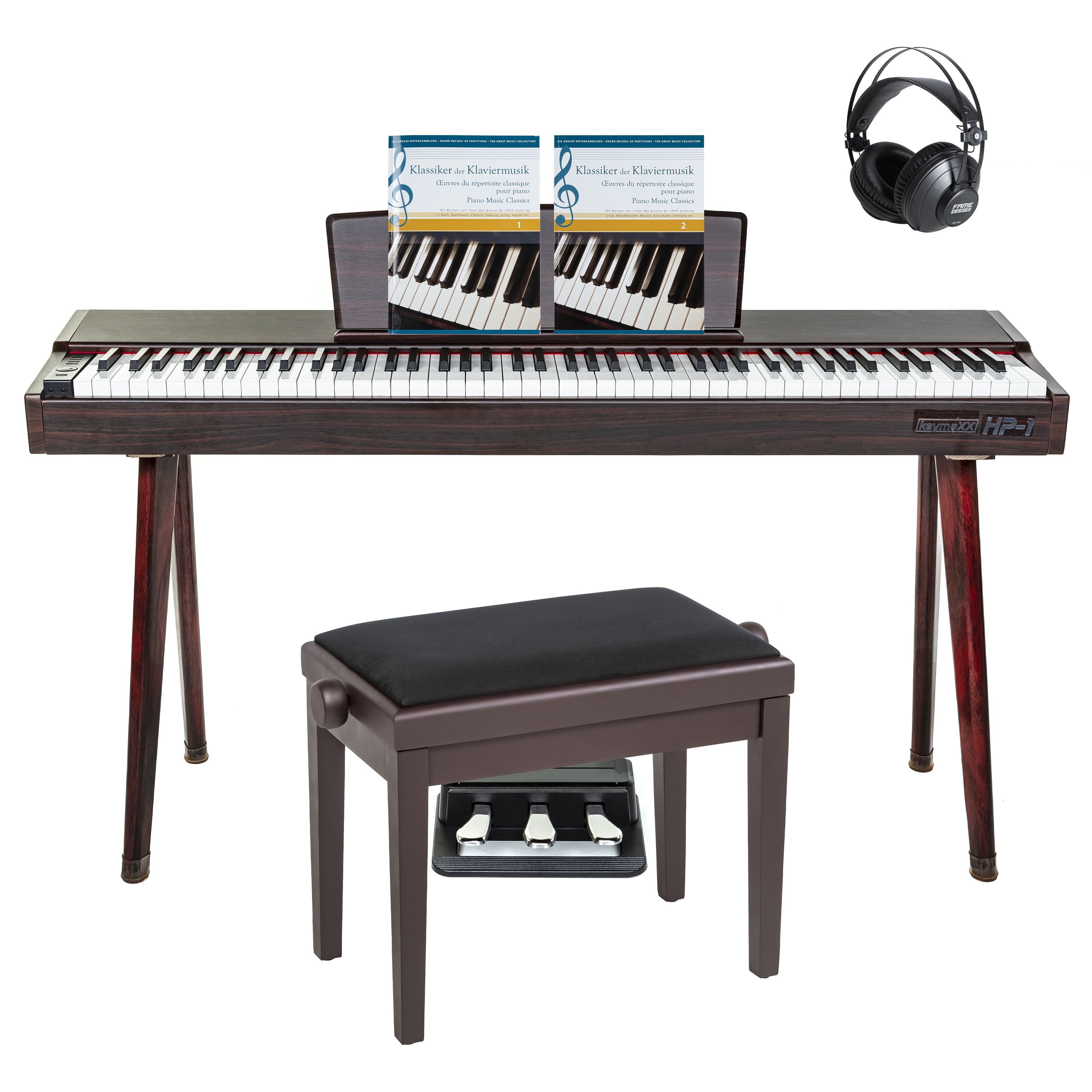 | Lieferumfang | Authentisches Spielgefühl mit 88 Tasten und Hammermechanik für dynamisches Klavierspiel. Dunkelbraunes, mattes Finish verleiht Eleganz und passt zu jeder Einrichtung. USB MIDI, Kopfhörer, LINE IN/OUT ermöglichen nahtlose Integration und ungestörtes Üben. Komplettset mit Klavierbank, Kopfhörer und Notensammlung für den sofortigen Start. Dreifachpedal und externe Stromversorgung für professionelle Kontrolle und Flexibilität. MS-ID: EPI707 Hersteller: keyMaxx Farbe: Dunkelbraun Farbbezeichnung: Dunkelbraun Oberfläche: Mattiert Bauform / Tastenanzahl: 88 Tastaturausführung: Hammermechanik Anschlagdynamik: Ja Tonerzeugung: Digital USB MIDI Schnittstelle: Ja Kopfhöreranschluss: Ja Speichermedium: USB Stick Lautsprecher: Ja Midi Schnittstelle: Ja LINE IN: Ja LINE OUT: Ja inkl. Netzteil: Ja Pedal mitgeliefert: Ja Anzahl Sounds: 1 Stromversorgung: Netzteil extern Ausführung: Dreifachpedal |