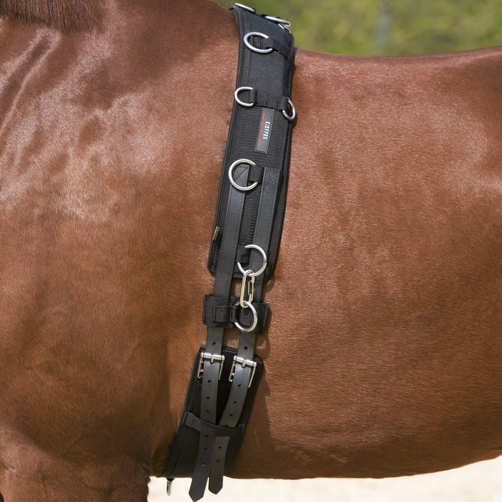 Kieffer-Longiergurt inklusive Bauchgurt mit weichem Widerristkissen für hohen Tragekomfort. Der Bauchgurt ist beidseitig doppelt zu gurten und die Bauchstrippen mehrfach verstellbar. Ausgestattet mit 100 % rostfreien Beschlägen.