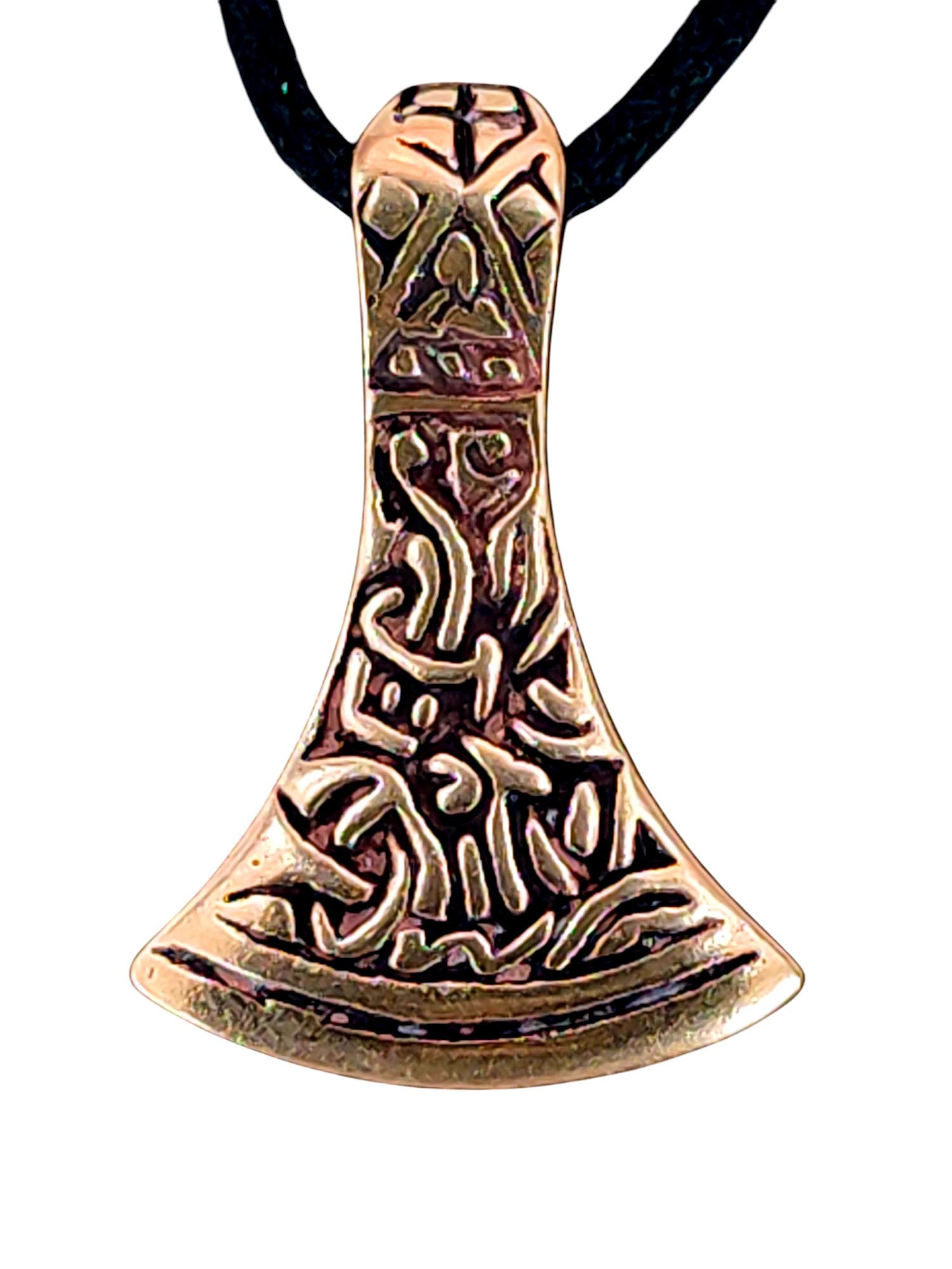Zierliche, kunstvoll verzierte Wikingeraxt aus Bronze. Die Verzierung befindet sich auf beiden Seiten des Axtblatts und ist geschwärzt, sodass sie optimal zur Geltung komm