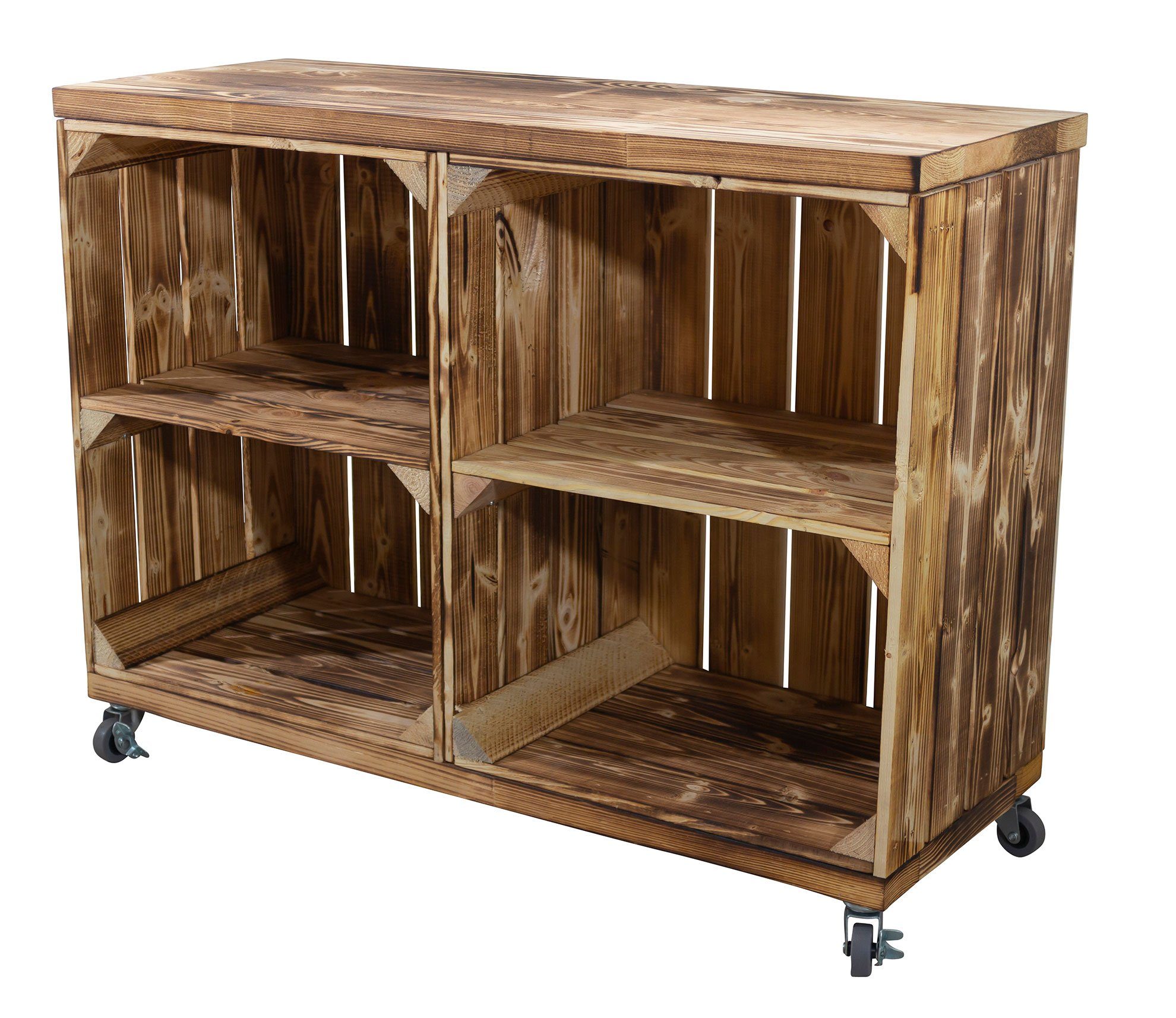 Die geflammte Holzbohle wird befestigt auf der oberen Seite der beiden geflammten Regalkiste mit Mittelbrett quer. Die 4 Rollen werden auf der unteren Seite der Regalkisten auf einer geflammten Blende mit Holzbohlenoptik angebracht. Dein neues Lieblingsstück wird fertig aufgebaut geliefert, du musst lediglich die 4 Rollen (2 Rollen inkl. Stopper) mit den mitgelieferten Schrauben befestigen. Schon hast du dein neues Regal!
