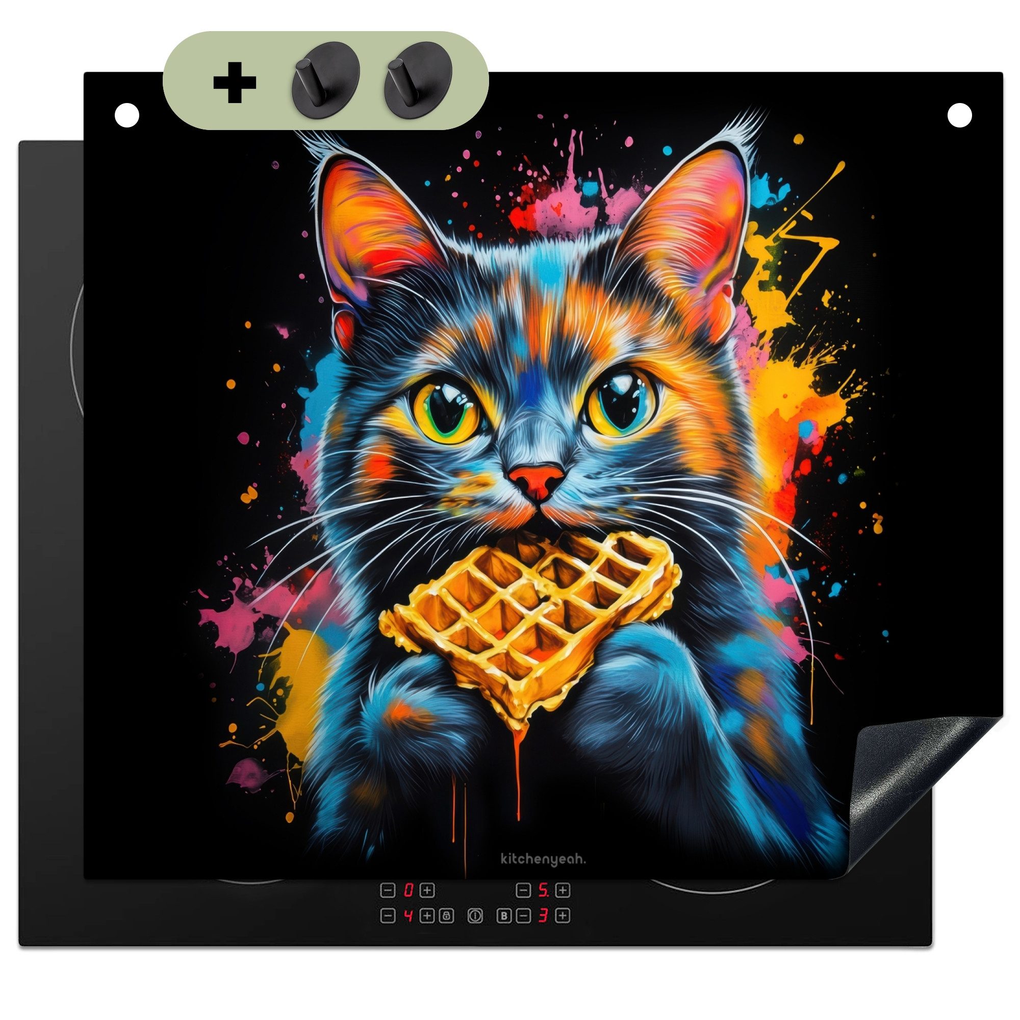 Eine farbenfrohe, gewaffelte Katze auf schwarzem Hintergrund.