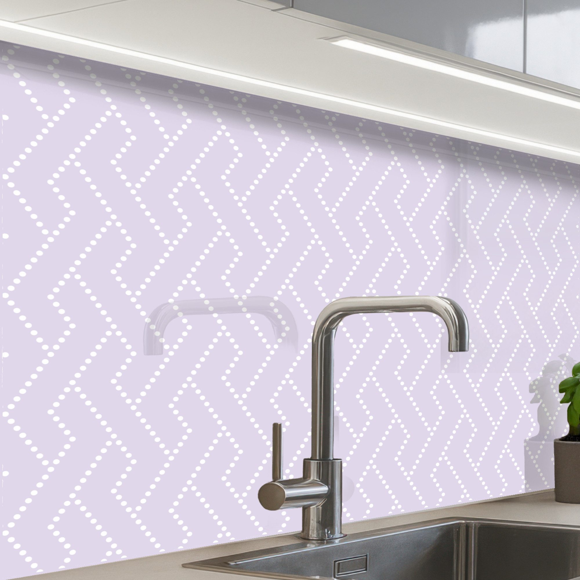 Sich wiederholendes Muster aus weißen Punkten auf einem hellvioletten Hintergrund, angeordnet in Zickzackformen. Die Punkte bilden ein rhythmisches und fließendes Ganzes, das einen verspielten Retro-Look erzeugt. Das Design wirkt weich, luftig und dekorativ.