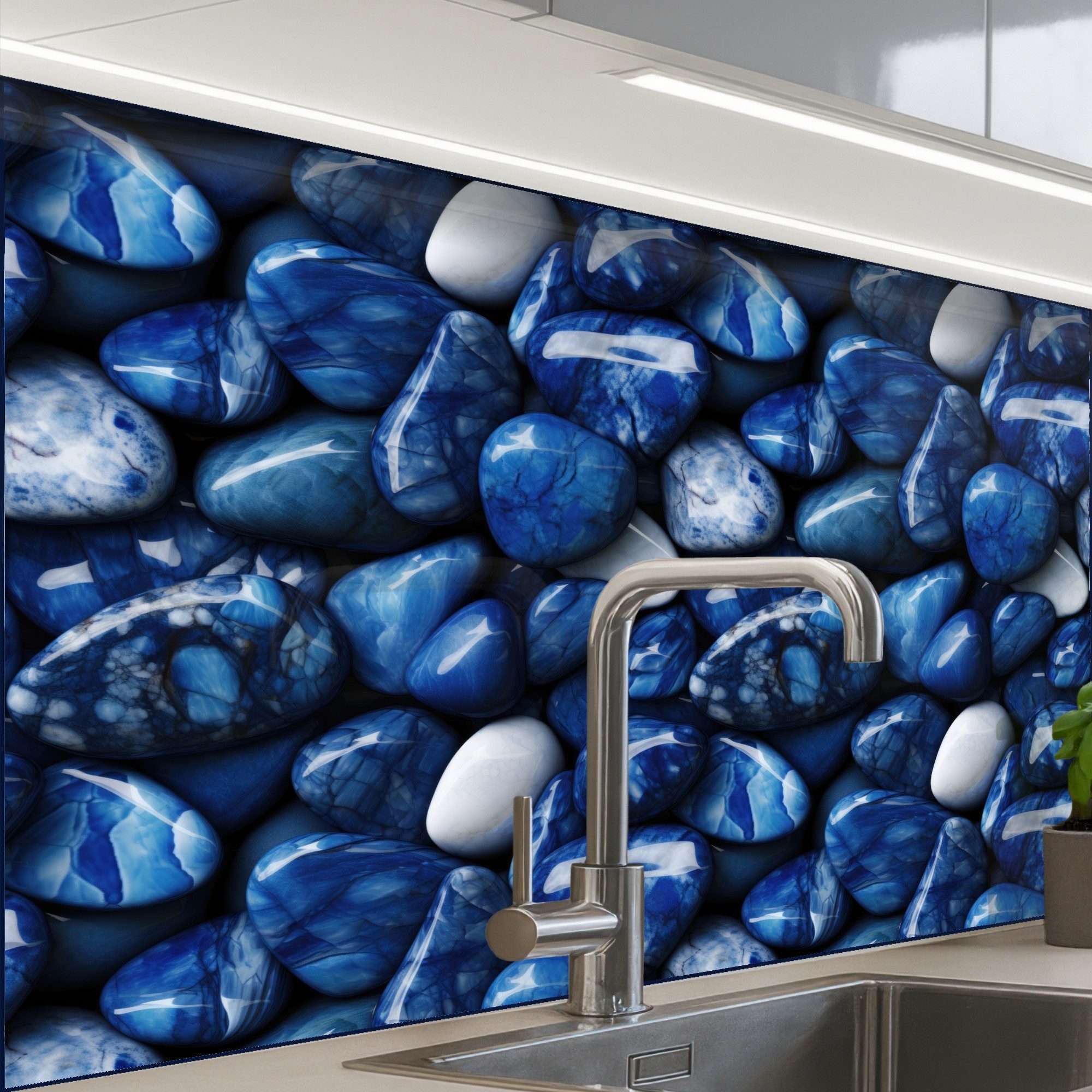Eine luxuriöse Kollektion abgerundeter Kieselsteine in intensivem Blau und Weiß, mit marmorähnlichen Adern und glänzenden Oberflächen. Die Kiesel haben einen Farbton von königsblau bis hellblau, mit einigen weißen Highlights. Das Ganze wirkt kühl, elegant und kristallartig.