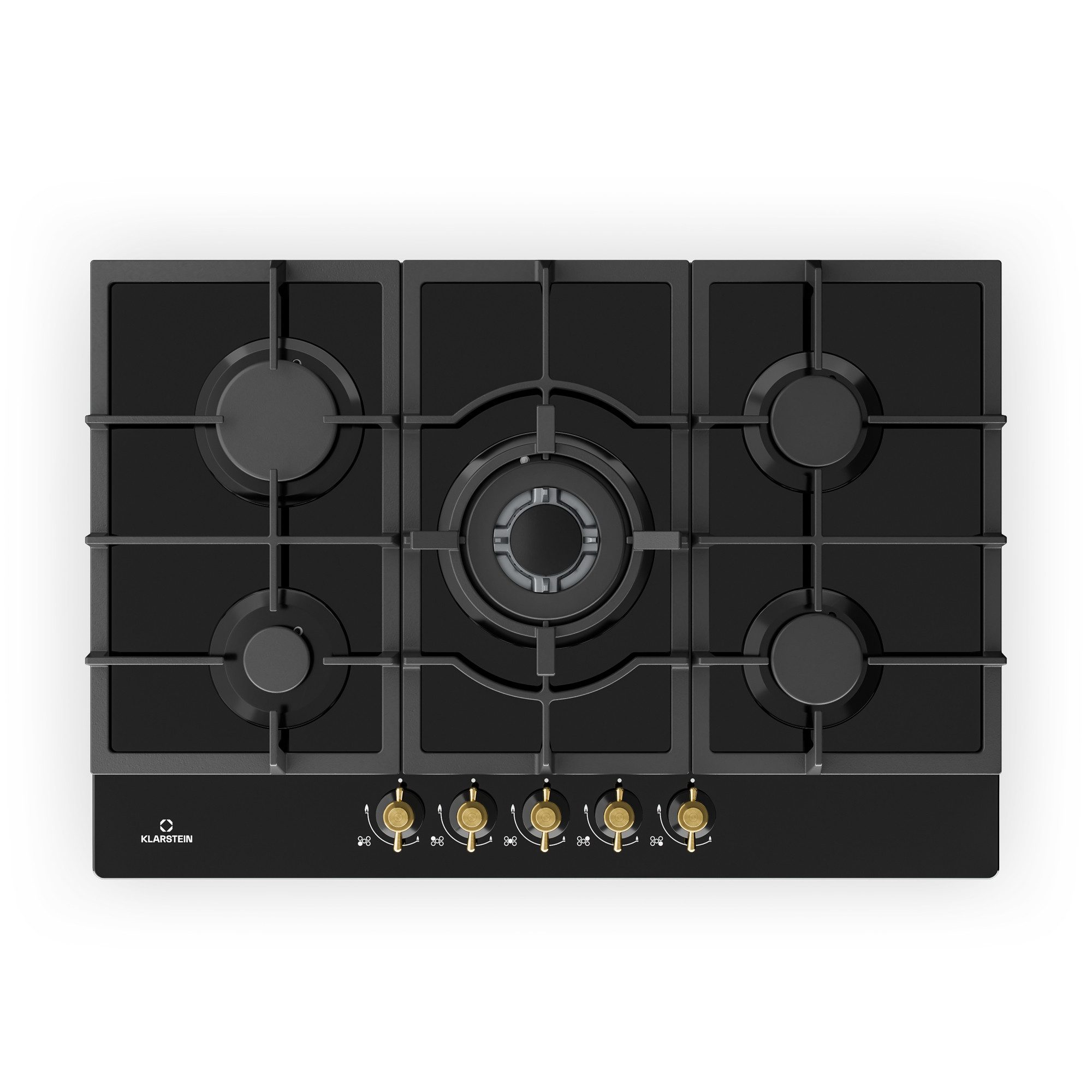 Auf dem geräumigen Klarstein Victoria 5 Gaskochfeld befinden sich fünf hochwertige Sabaf-Brenner, die mit einer Leistung von jeweils 3,6 kW, 3,0 kW und 1 kW sowie zweimal 1,75 kW ordentlich einheizen. Durch seine unterschiedlichen Brenner-Größen ist das Victoria 5 für jede erdenkliche Mahlzeit geeignet - dabei verteilen die Brenner die Hitze gleichmäßig in der Mitte und an den Rändern deines Kochgeschirrs, so wird alles perfekt gegart. Die Bedienung ist dank der selbsterklärenden Symbole an den großen im Retro-Design gestalteten Drehknöpfen absolut intuitiv, die Hitzezufuhr kann während des Kochvorgangs immer wieder direkt angepasst werden. Via SnapJetIgnition entzündest du die Flamme, somit ist kein zusätzliches Feuer nötig. Die drei abnehmbaren Kreuze aus massivem Gusseisen sitzen passgenau und kippsicher über den Flammen. Das Kochfeld ist mit einer gehärteten, pflegeleichten Keramikglas-Beschichtung versehen, die nicht nur gut aussieht, sondern auch besonders leicht zu reinigen ist.
