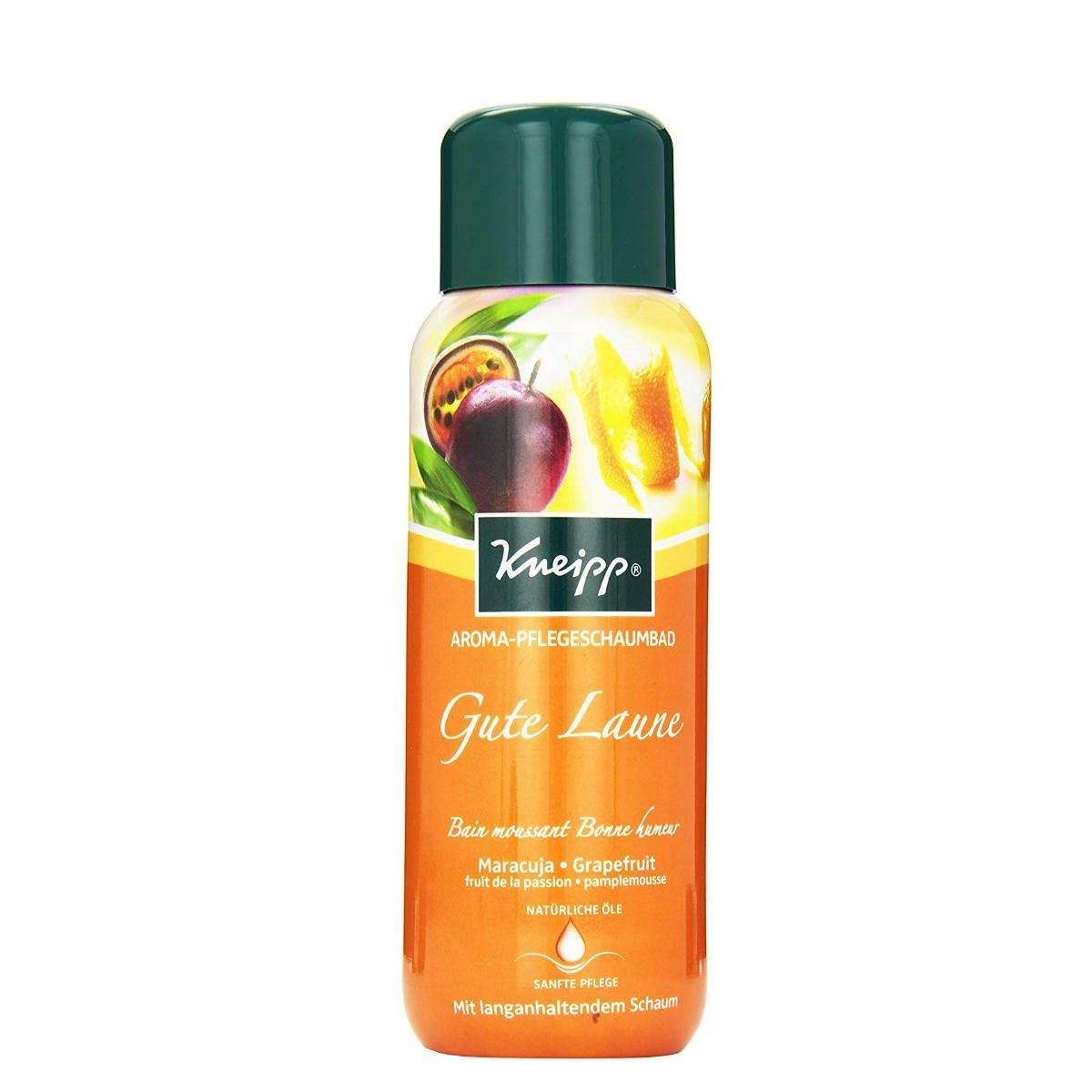 Mit dem fruchtig heiter duftenden Kneipp® Aroma-Pflegeschaumbad Gute Laune mit natürlichen Ölen aus Maracuja und Grapefruit löst sich Trübsal in Luft auf. Genießen Sie unbeschwert einen Moment des Glücks. Sein exotischer Duft belebt die Sinne und zaubert ein Lächeln auf Ihr Gesicht. Natürliches pflegendes Öl macht die Haut zart und geschmeidig. Das Zusammenspiel von fröhlichem Duft, intensiver Farbe und langanhaltendem Schaum macht dieses Bad zu einem ganzheitlichen Erlebnis für alle Sinne.