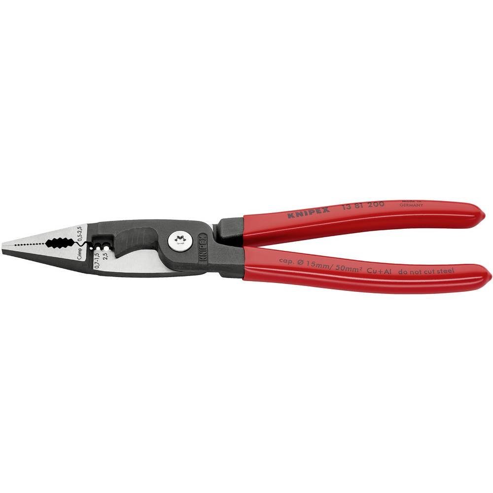 6 Funktionen in einer Zange. Multifunktionszange für die Elektroinstallation. Zum Greifen von Flach- und Rundmaterial, Biegen, Entgraten, Kabelschneiden, Abisolieren und Crimpen von Aderendhülsen. Glatte Greifflächen an der Spitze für ein beschädigungsfreies Greifen von Einzeladern. Profilierte Greifflächen und Brennerloch zum Greifen von Flach- und Rundmaterial. Markante Außenkante an der Backe zum Bearbeiten von Unterputzdosen und Entgraten von Durchführungslöchern. Abisolierlöcher für Leiter 0,75 - 1,5 mm² und 2,5 mm². Crimpnest für Aderendhülsen 0,5 - 2,5 mm². Kabelschere mit Präzisionsschneiden (induktiv gehärtet) für Cu- und Al-Kabel bis 5 x 2,5 mm² / Ø 15 mm. Schlanke Bauform für gute Zugänglichkeit. Geschraubtes Gelenk: präziser, spielfreier Gang der Zange. Spezial-Werkzeugstahl in Sondergüte, geschmiedet, mehrstufig ölgehärtet.