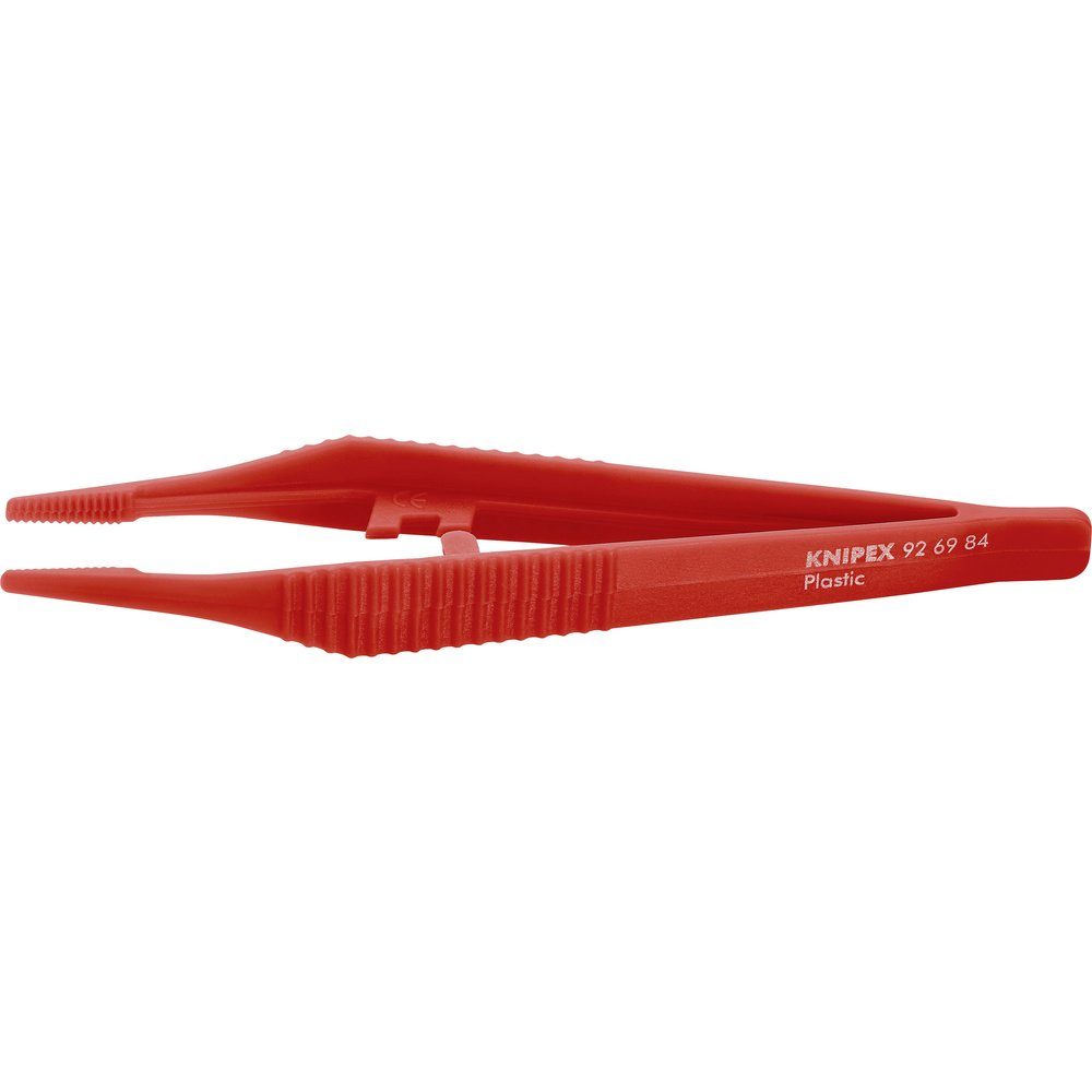 Stabile Kunststoff-Pinzette. Trapezförmige Spitze, ca. 3,5 mm breit. Greifflächen gezahnt. Geriffelte Griffe. Temperaturbeständig bis ca. 130° C.