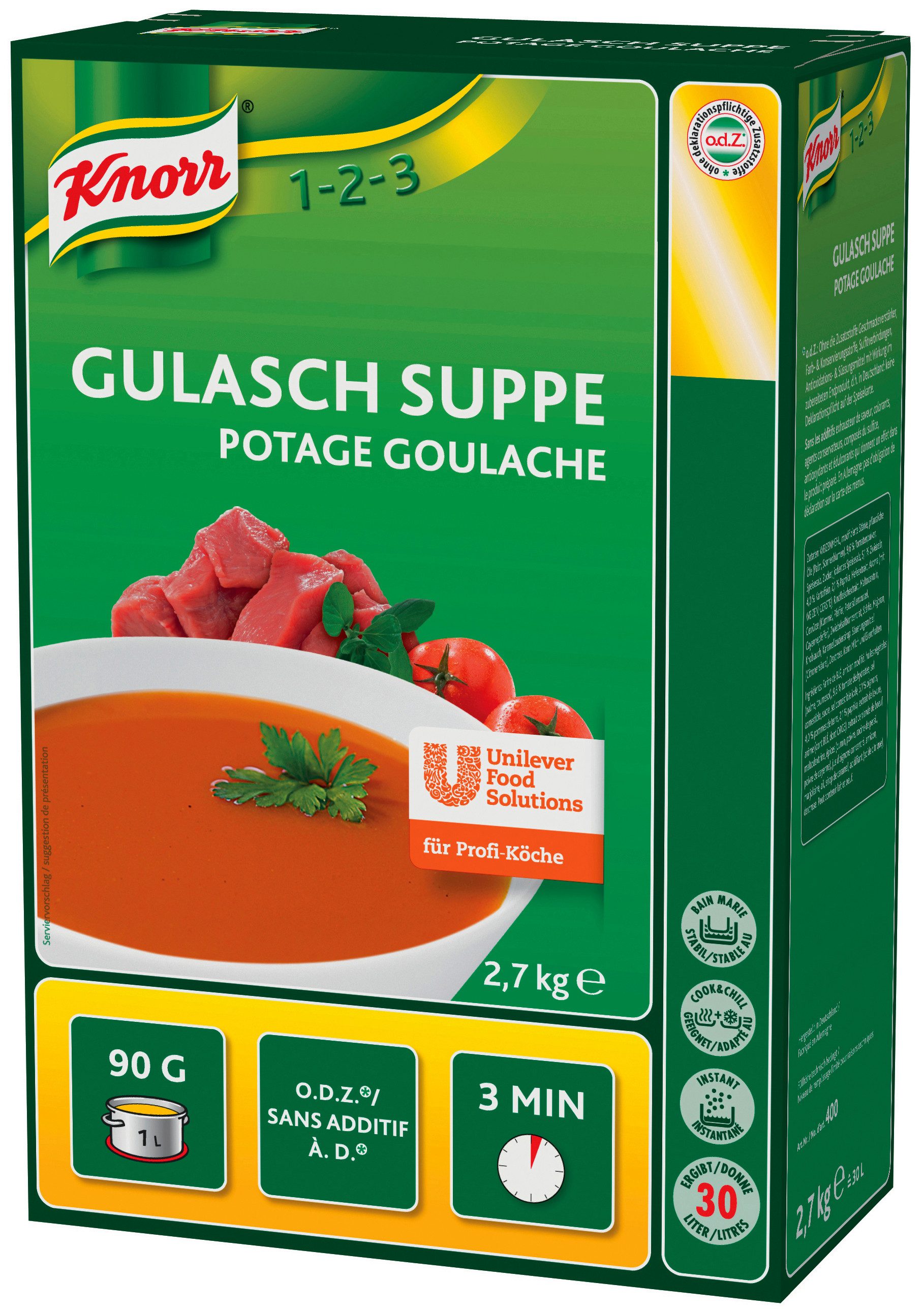 UNILEVER PLC Knorrstraße 1, 74074 Heilbronn Trocken und vor Wärme geschützt lagern Packungsinhalt in kaltes, warmes oder kochendes Wasser einrühren. Bei mittlerer Hitze 3 Minuten kochen lassen _ dabei gelegentlich umrühren. Bei Entnahme von Teilmengen den Packungsinhalt vorher gut durchmischen. Trockenmischung zur Herstellung einer Gulasch Suppe 1er Pack Maltodextrin, modifizierte Stärke, Tomatenpulver, Speisesalz, Stärke, Zucker, Reismehl, jodiertes Speisesalz, 5,1 % Zwiebeln, 4,0 % Kartoffeln, 2,2 % Paprika, pflanzliche Öle (Palm, Sonnenblume), Hefeextrakt, Aroma, Rindfleischextrakt, Gewürze (Kümmel, Pfeffer, Petersilienwurzel, Cayennepfeffer), Zwiebelsaftkonzentrat, Majoran, Knoblauch, Karamellzuckersirup, Säuerungsmittel(Citronensäure). ¹o.d.A.: Die Rezeptur enthält keine deklarationspflichtigen Zutaten mit allergenem Potential gemäß der Verordnung EU Nr. 1169/2011 (Anhang II).¹ ¹ Technologisch unvermeidbare Spuren von Gluten, Milch, Ei, Sellerie und Senf können nicht ausgeschlossen werden. Getreidekörner, die Gluten enthalten, Weizen Energie kj 119 kj Energie kcal 28 kcal Fett 0,5GRM Fett davon gesättigte Fettsäuren 0,1GRM Kohlenhydrate 5,7GRM Kohlenhydrate davon Zucker 1,3GRM Eiweiß 0,7GRM Salz 1,3GRM Trocken und vor Wärme geschützt lagern