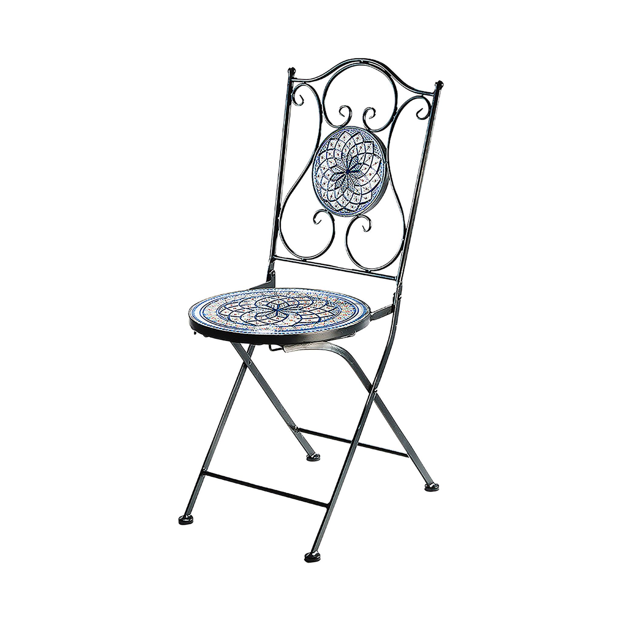 Dieser Klappstuhl von Kobolo ist aus Metall in schwarz gefertigt und die Sitzfläche ist mit einer Keramikplatte in blau-weißer Mosaikoptik verziert. In Kombination mit einem passenden runden Tisch ergänzt dieses Mosaikmöbel jede Gartendekoration perfekt. Der Stuhl lässt sich zur Überwinterung im Innenbereich platzsparend zusammen klappen. Wollen Sie sich lange an Ihrem Möbelstück erfreuen, lagern Sie dieses bitte möglichst witterungsgeschützt - Nicht frostsicher.