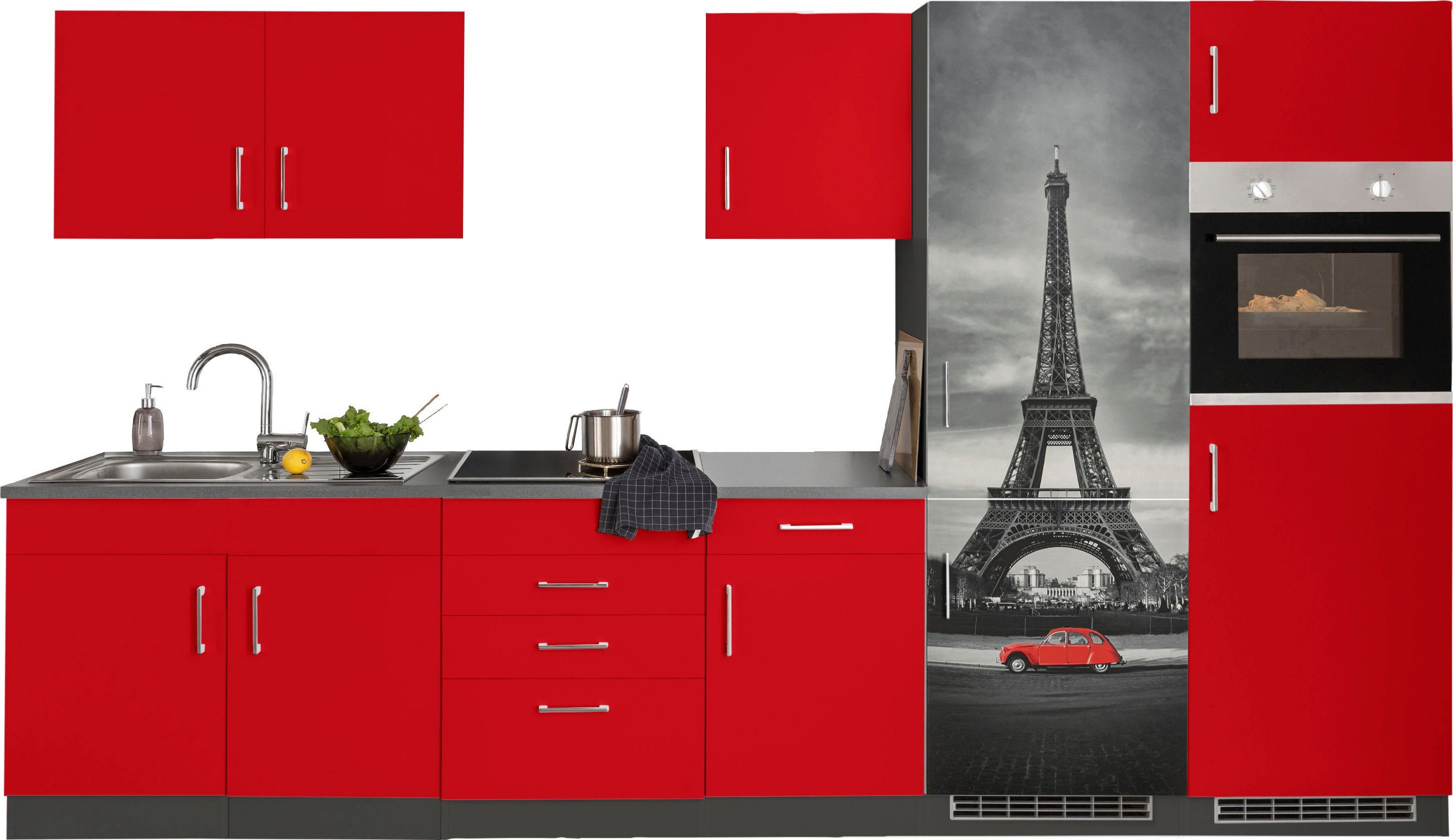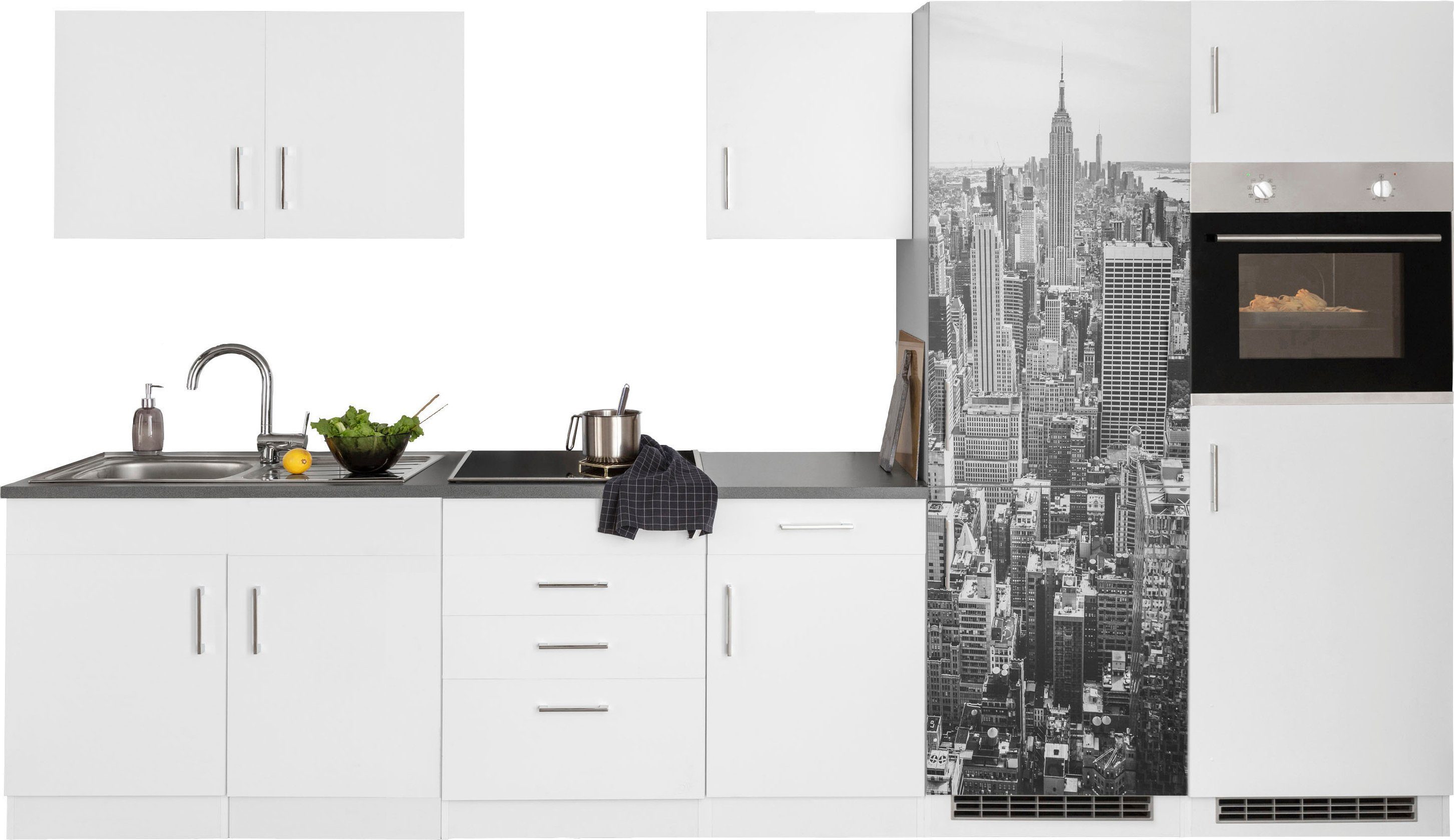 | Ausstattung | Durchgehende Arbeitsplatte Metallgriffe Seitenverkehrt stellbar inkl. Edelstahl-Einbauspüle, mit Abtropffläche ohne E-Geräte |