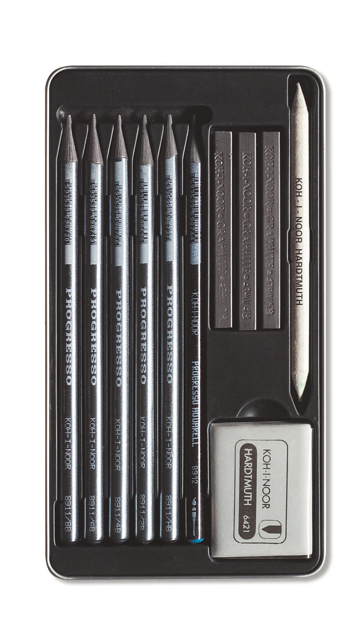 Koh-I-Noor Künstler- Set 11- teilig " Gioconda Art - Set " im Metalletui kleines hochwertiges Künstler- Set " Art - Set " im Metalletui je 1 Progresso- Stift 8911/HB, 2B, 4B, 6B 8B + 1 Progresso- Aquarellstift 8912/4B + je 1 Graphitstift 4390/2B, 4B, 6B + 1 Knetradiergummi und 1 Papierwischer