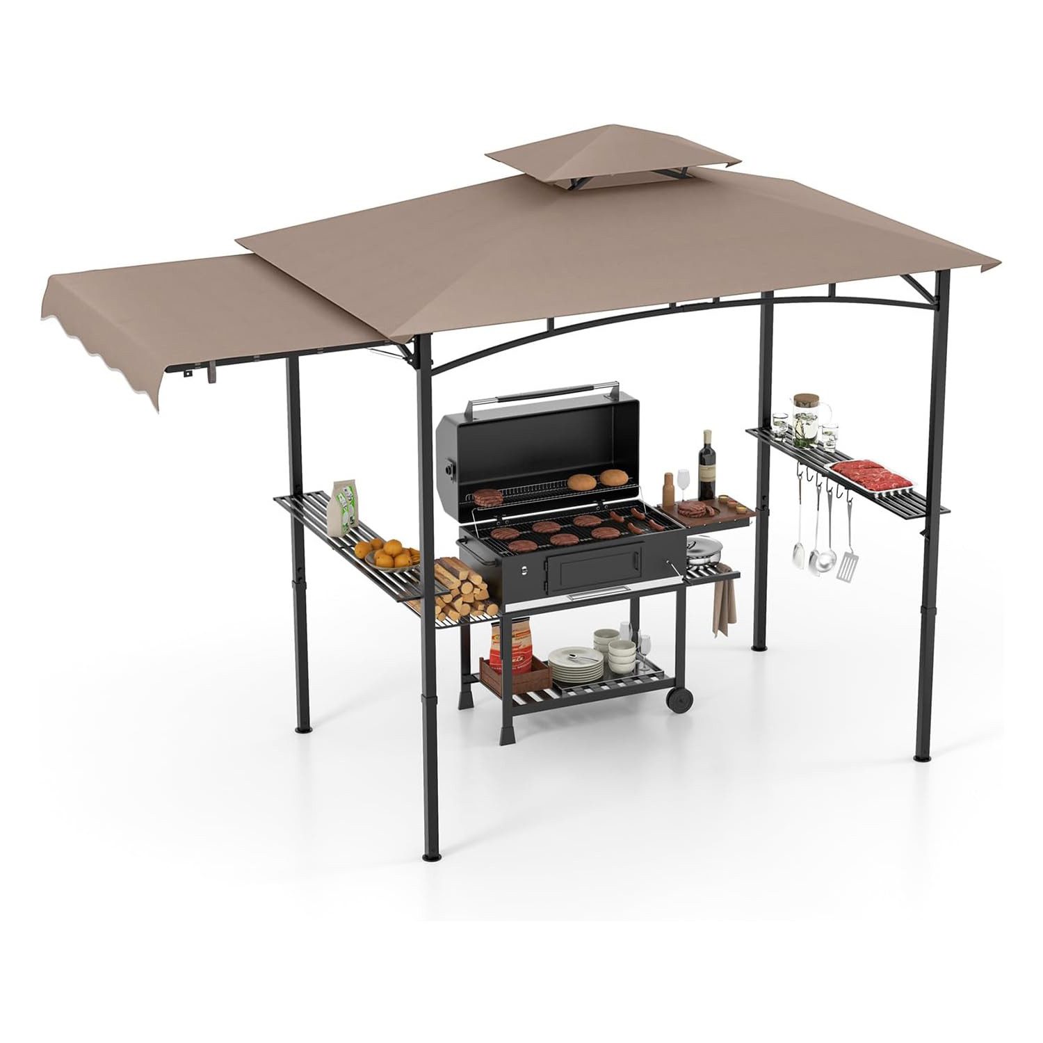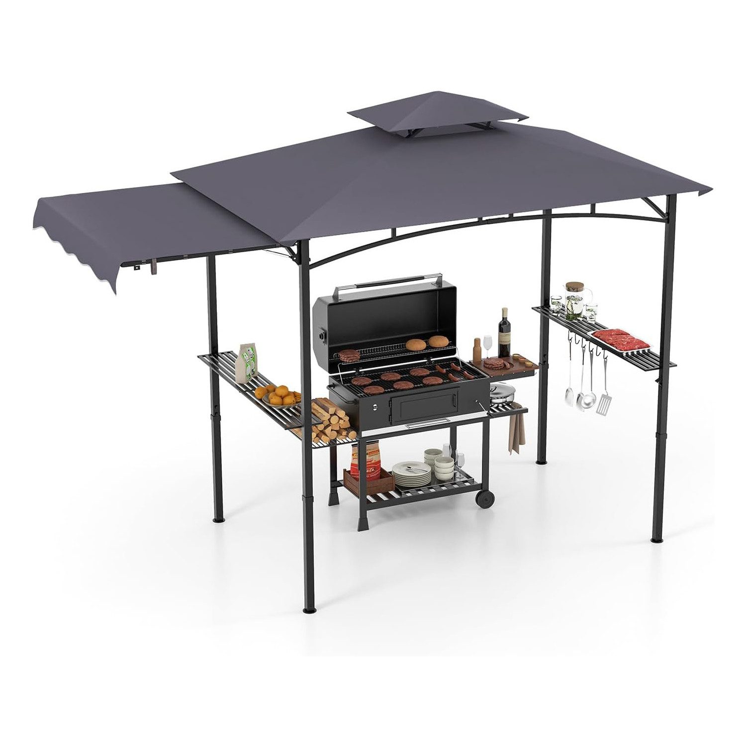 Der große Grillpavillon bietet viel Schatten. Die Seitenplanen lassen sich einfach auf- und zuklappen, so dass Sie das Dach ganz nach Ihren Wünschen gestalten können. Außerdem ist das Pavillonzelt mit einem flammenhemmenden Sonnenschutzgewebe aus Polyester ausgestattet, das vor Sonnenstrahlen schützt. Ausgestattet mit Stehtischen und 6 Haken bietet der Grillpavillon ausreichend Stauraum für Ihr Grillzubehör. Der Pavillon hat ein belüftetes Dach und 8 Erdnägel für zusätzlichen Windwiderstand.