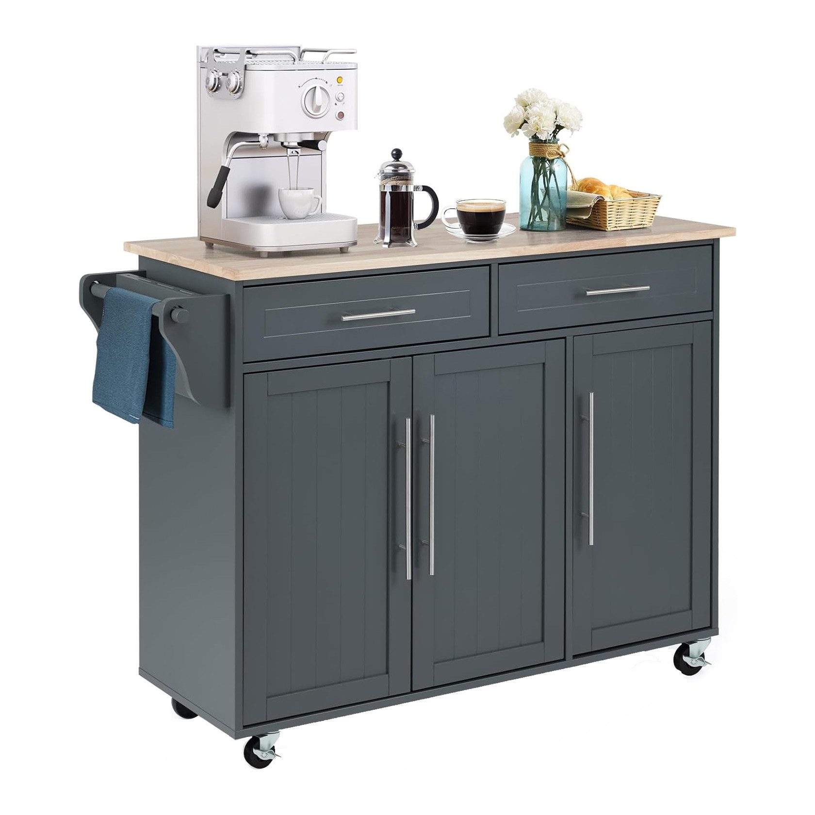 Dieser Servierwagen bietet ausreichend Stauraum und Ausstellungsfläche, damit Ihre Küche übersichtlicher und aufgeräumter aussieht. Der Küchenwagen verfügt über höhenverstellbare Regale, die Sie nach Bedarf anpassen können. Die große wasserdichte Arbeitsplatte erlaubt die Aufbewahrung von Küchengeschirr, sowie die Vorbereitung und Präsentation von Speisen. Mit vier 360-Grad-Rollen kann sich dieser Kücheninselwagen im Zimmer flexibel bewegen. Der Seitengriff erleichtert das Schieben oder Ziehen des Wagens, und kann auch als Handtuchhalter genutzt werden. Dank seines kompakten Designs ist der Küchenwagen ideal für kleine Räume wie Küchen, Apartments, Flure usw.