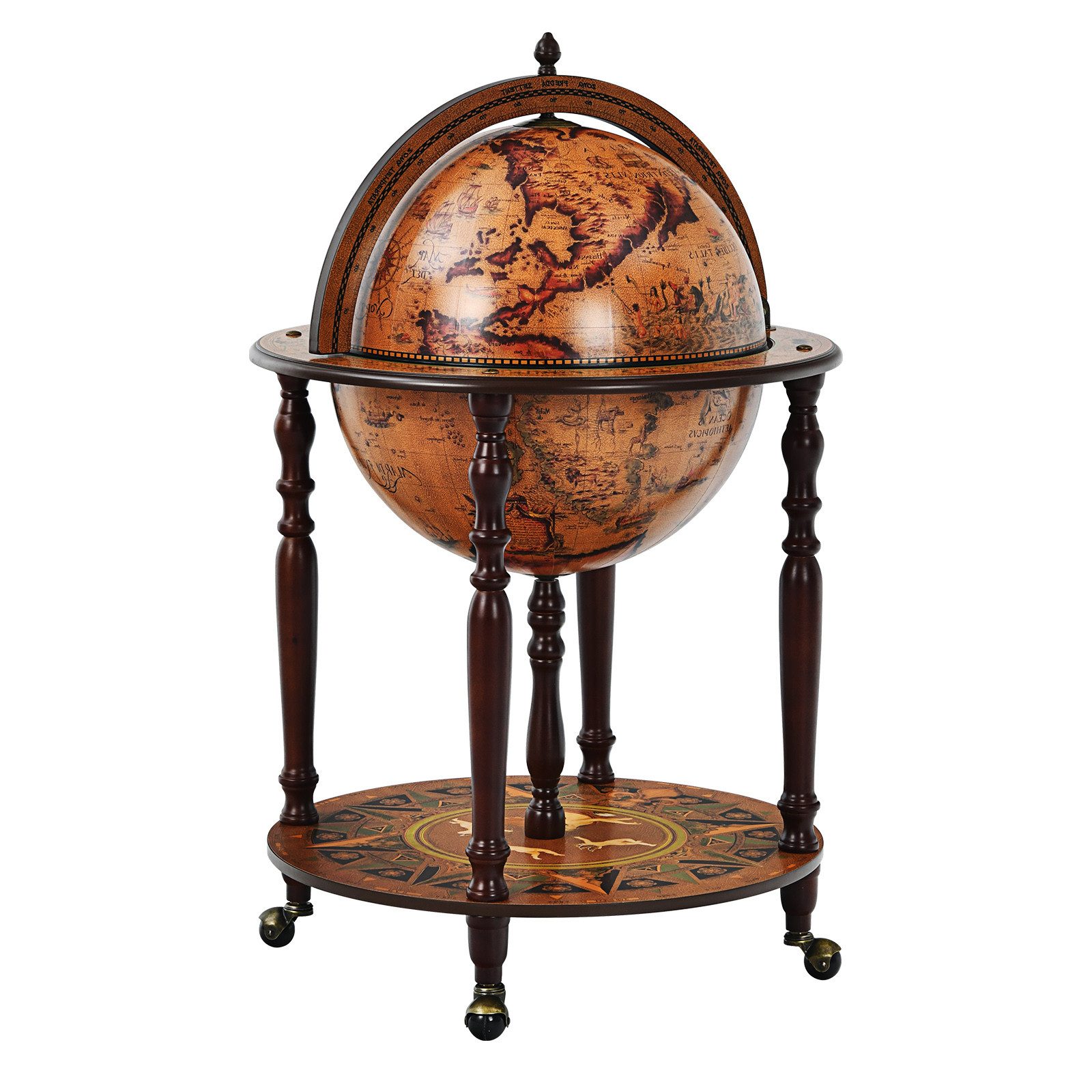 Diese Globusbar sieht nicht nur gut aus und kann als dekoratives Element verwendet werden, sondern ist auch sehr praktisch. Die große Ablagefläche bietet Platz für Gläser, Flaschen usw. und die untere Ablagefläche bietet Ihnen zusätzlichen Stauraum. 4 um 360° drehbare Räder erleichtern die Bewegung der Bar, so dass Sie Ihren Wein mühelos zu Ihrer Zufriedenheit transportieren können. Die aus MDF und vier Massivhölzern gefertigte Bar ist strukturell stabil und kippsicher. Sie können ihn zu Hause oder im Restaurant als Hausbar, Minibar, Restaurantwagen usw. verwenden.