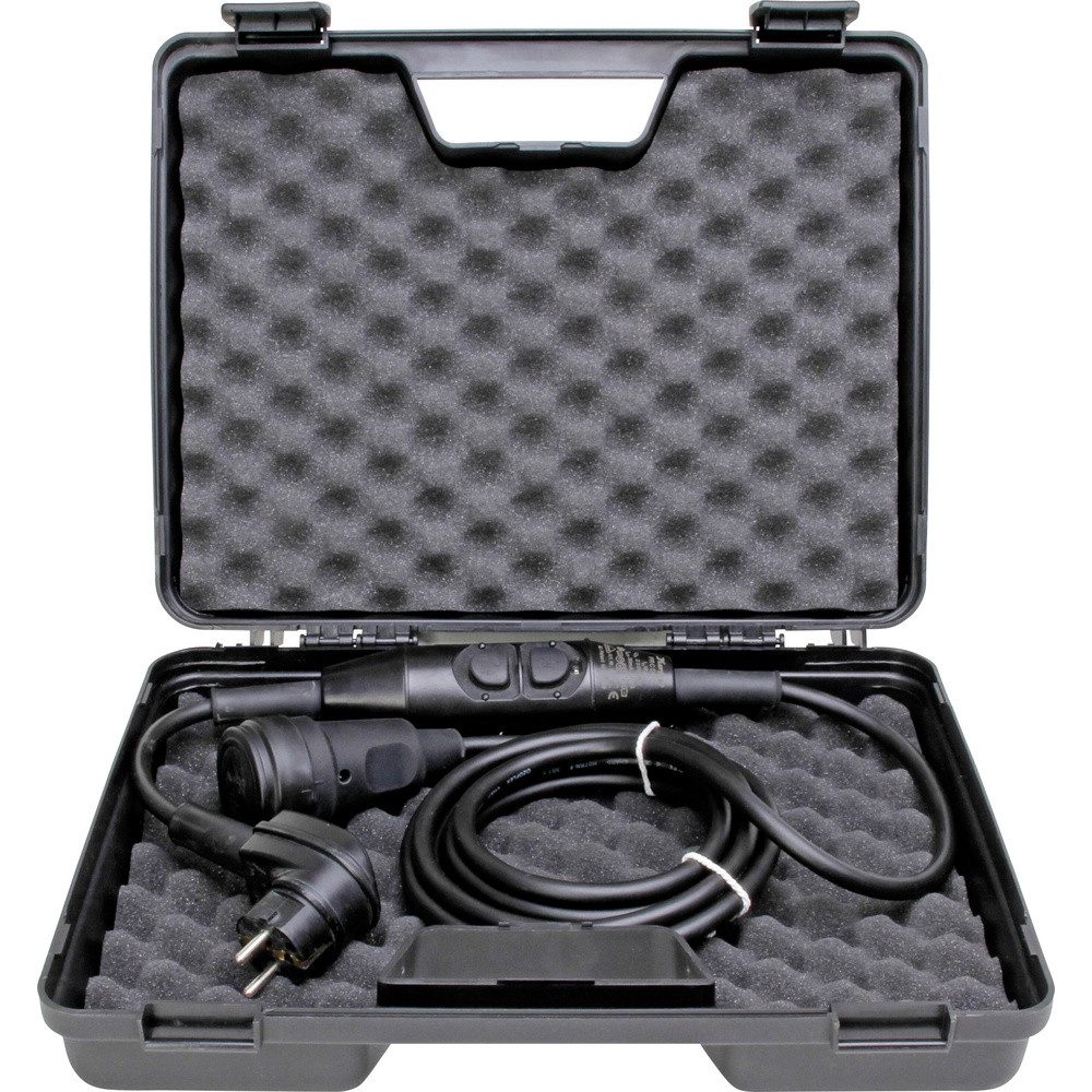 PRCD-S, mit Schutzleiterüberwachung, 3-polig schaltend, Nennfehlerstrom 0,03A, Typ A, 230V, 16A, 50Hz, Schutzart IP44, im robusten Koffer, Vollgummi-Winkelstecker und Vollgummi-Kupplung mit Deckel, Leitungslänge Steckerseite 15cm, Leitungslänge Kupplungsseite 300cm, Leitung: H07RN-F3G1,5mm²
