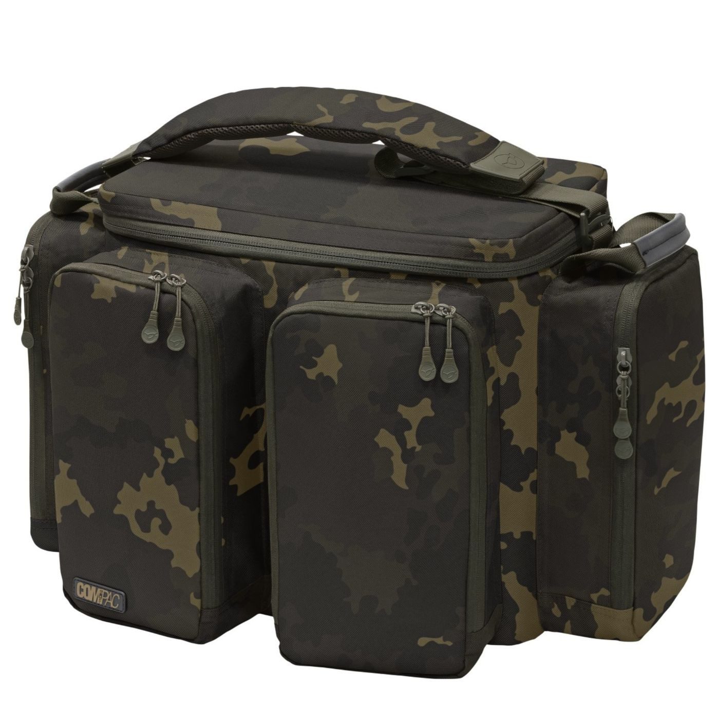 Korda Compac Large Carryall Dark Kamo - Der Compac Large Carryall Dark Kamo aus dem Hause Korda ist eine robuste Angeltasche für Karpfentackle. Das stabile und wasserabweisende Gewebe zusammen mit dem verstärkten Boden schützen den Inhalt der Tragetasche effektiv vor Beschädigung und Verschmutzung. Der feste Deckel der Karpfentasche lässt sich auch als Biwak Tisch benutzen, sodass man nicht extra einen sperrigen Tisch mitnehmen muss. Das große Hauptfach im Inneren bietet viel Stauraum, während die kleinen Taschen innen und außen Platz für Verschiedenes bieten. In die modulare Tasche passen beispielsweise die Compac 140, zwei Compac 100 oder eine Compac 110 und eine Compac 100 hinein. Eine gute Tasche für die schnelle Session mit leichtem Gepäck.